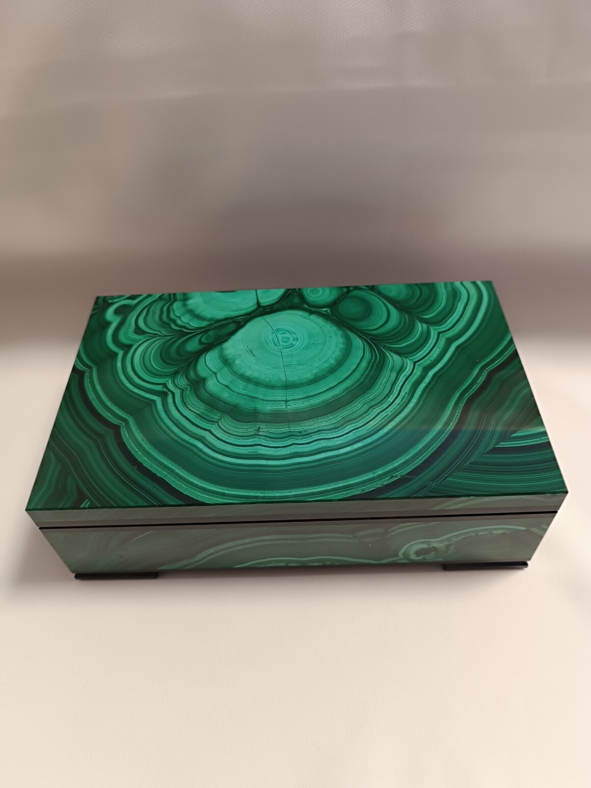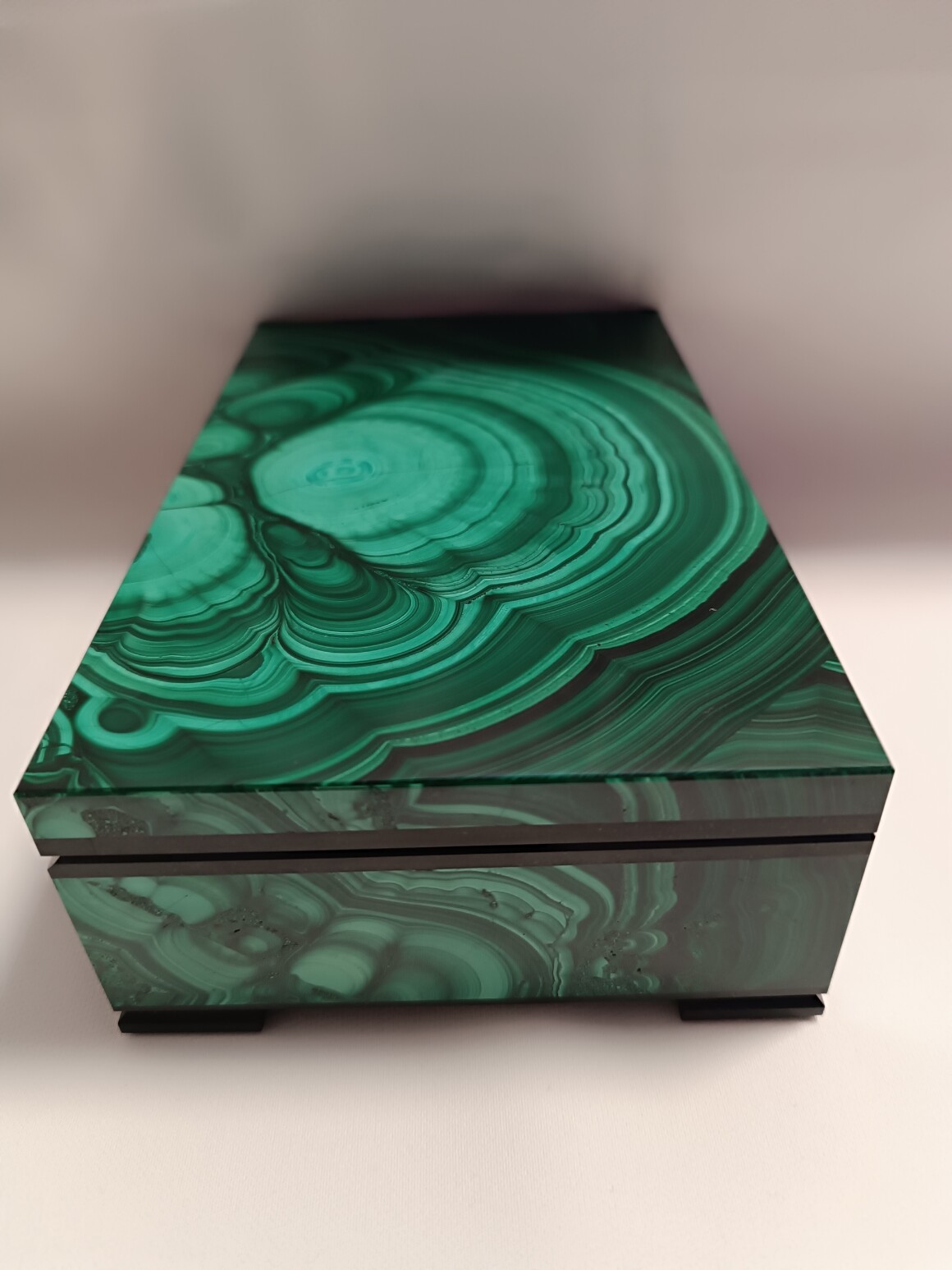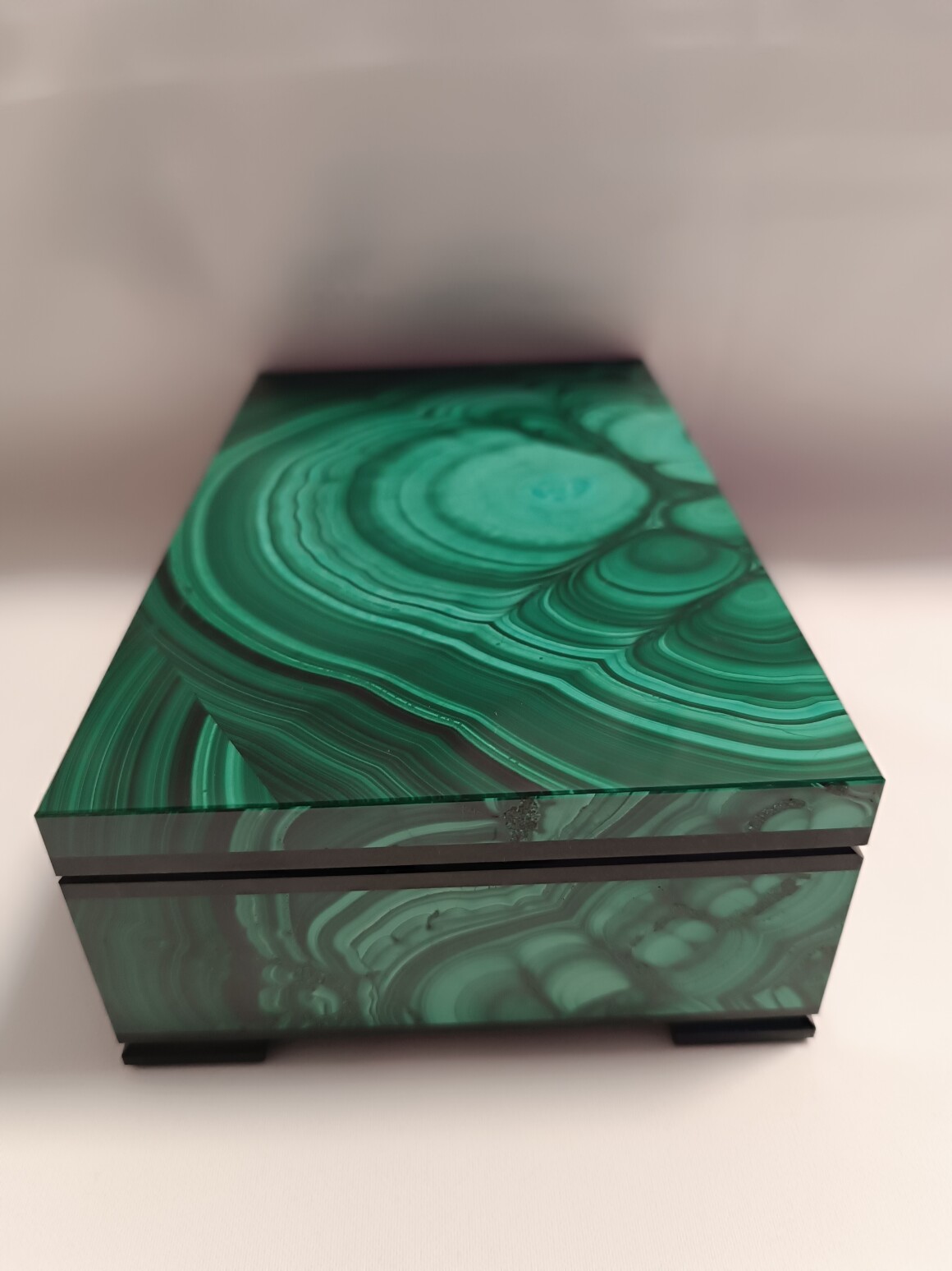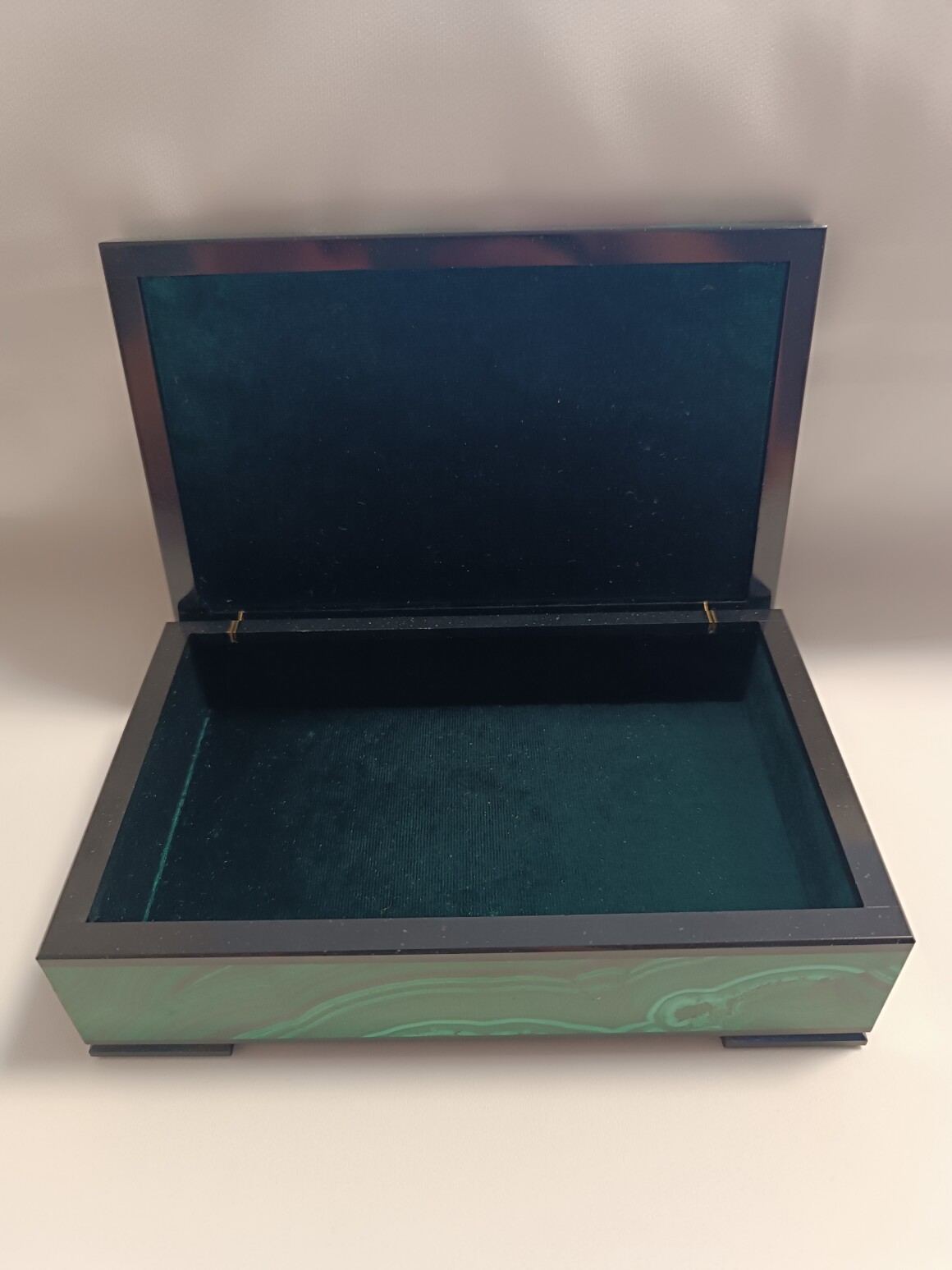 Шкатулка сделана Уральским Мастером из природного малахита . Шкатулка внутри обклеена зеленым бархатом. На ножках наклеена специальная ткань чтоб не царапать поверхность. Ножки рамки сделаны из долерита , шарниры из латуни (Ручная работа)