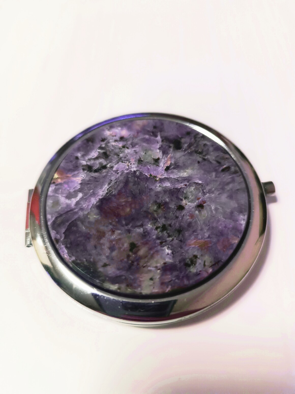 Карманное чароитовое зеркало. Диаметр зеркала 70 мм, толщина 11 мм. Внутри два зеркала одно увеличивает в два раза. Сам корпус металлический цвет серебро сверху сделана и наклеена вставка из природного чароита Уральским Мастером. К зеркалу прилагается чехол.