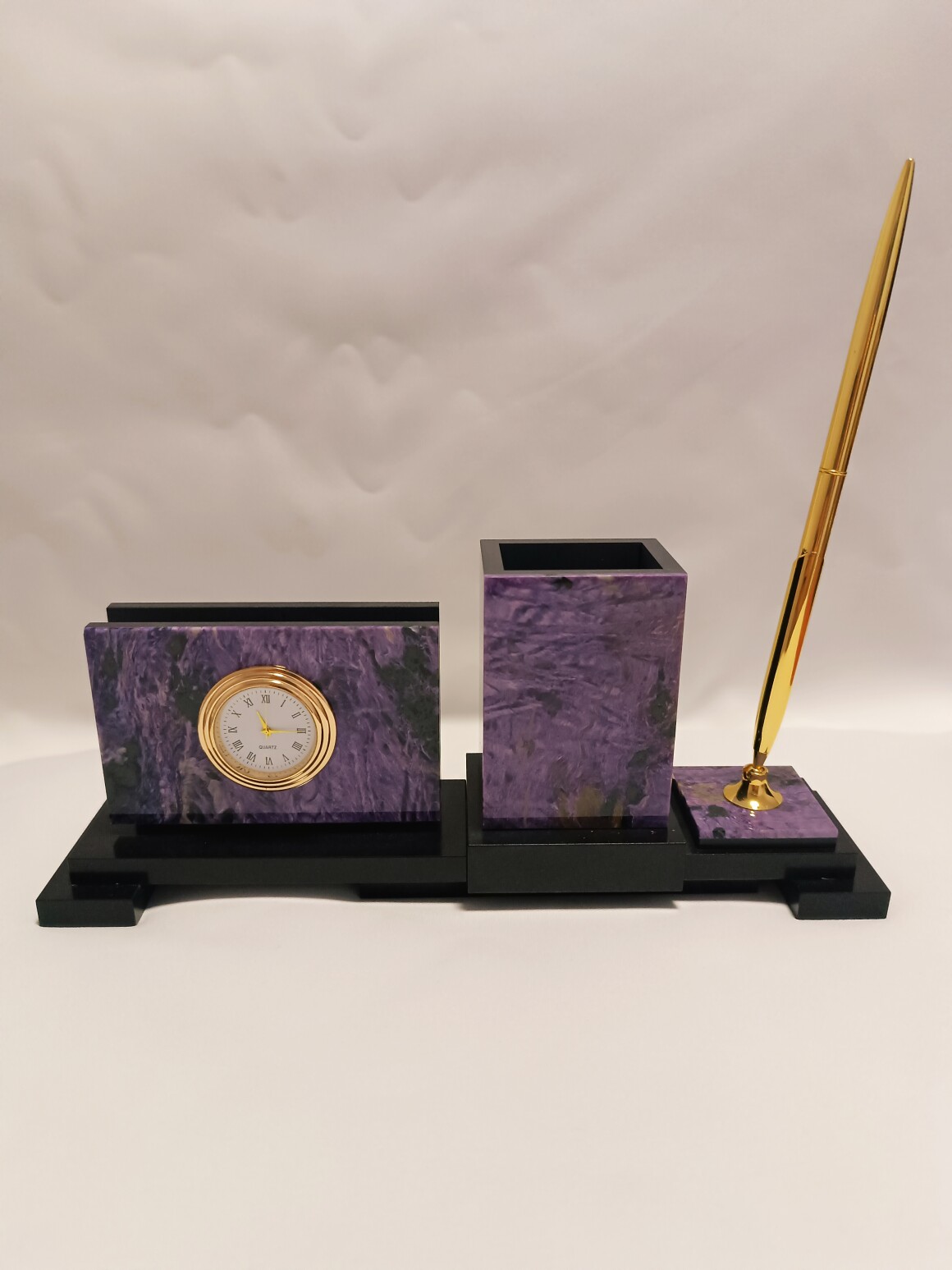 Изготовлен Уральски Мастером из природного чароита долерита и латуни.Кварцевые часы.