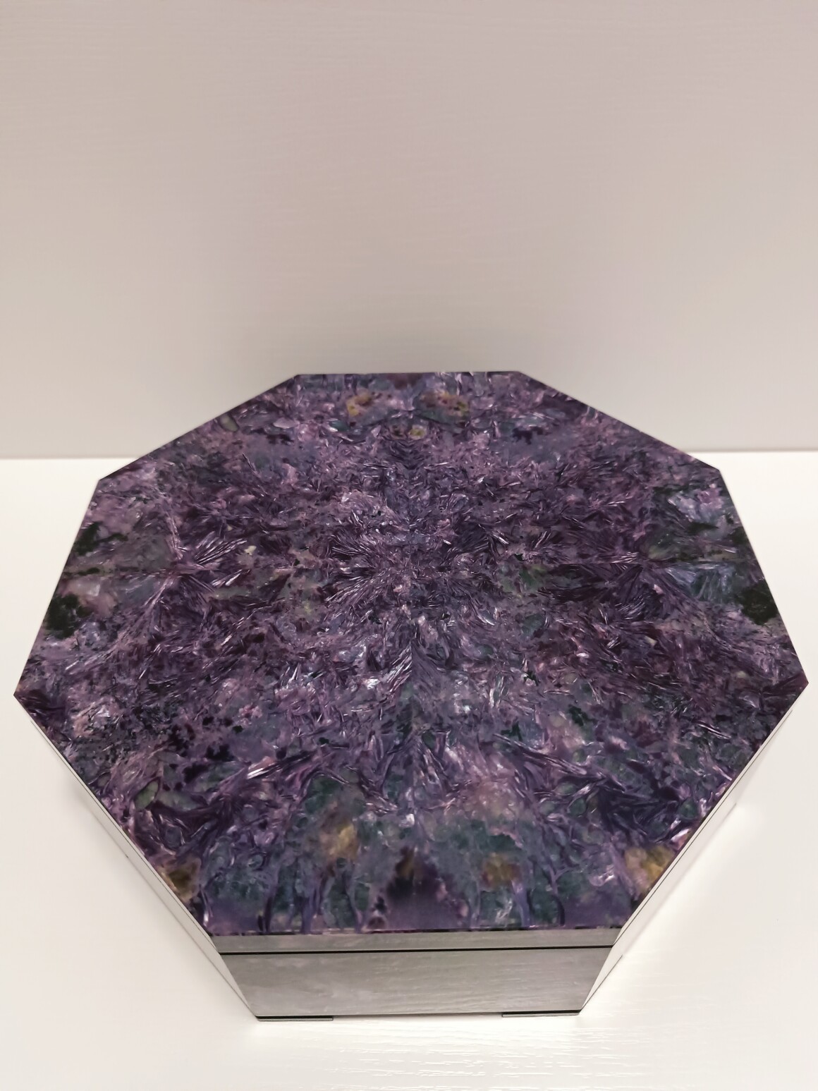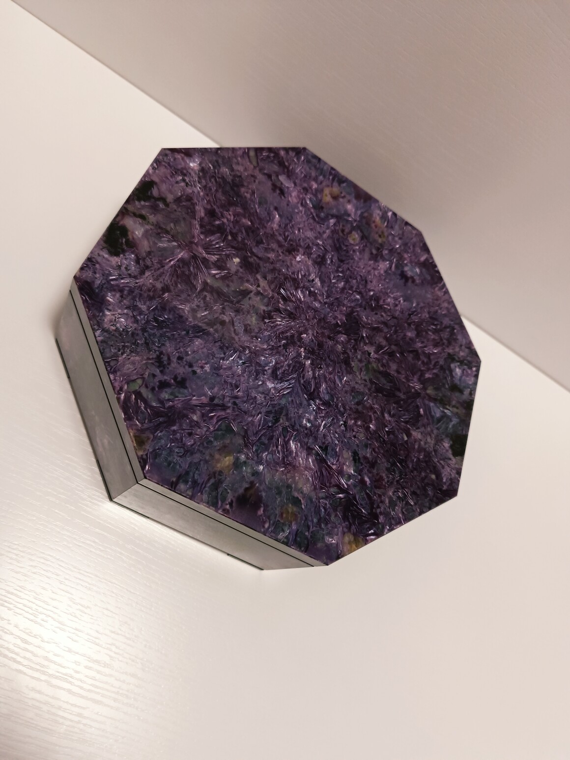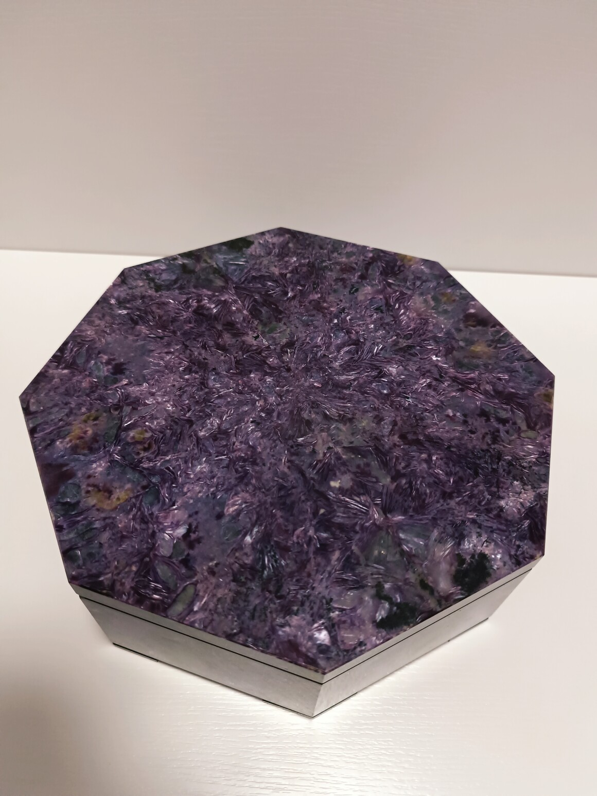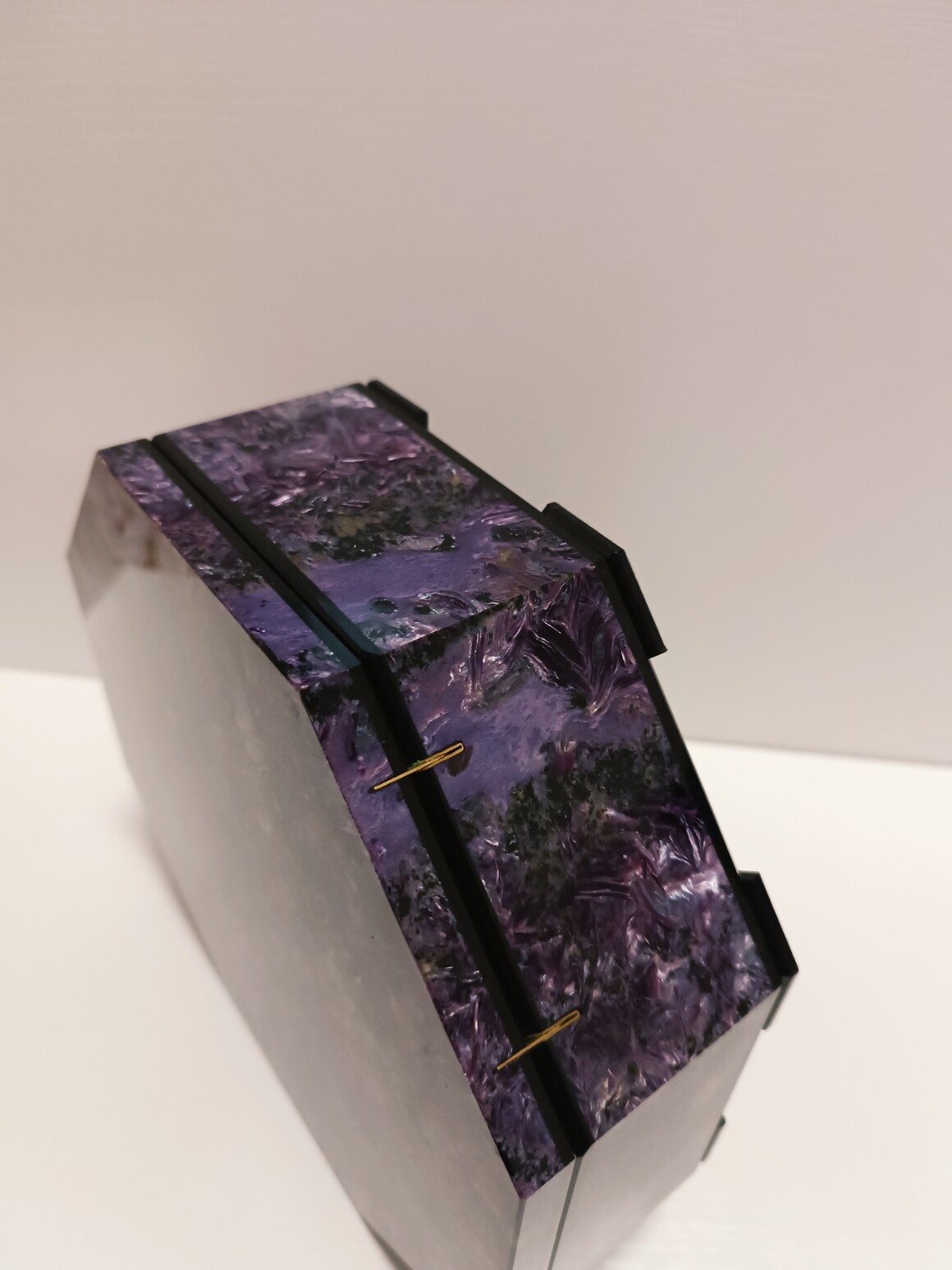 Шкатулка сделана Уральским Мастером из природного чароита. Шкатулка внутри обклеена бархатом. На ножках наклеена специальная ткань чтоб не царапать поверхность. Ножки рамки сделаны из долерита , шарниры из латуни (Ручная работа) Шкатулка вместительная , можно хранить не только ювелирные изделия.