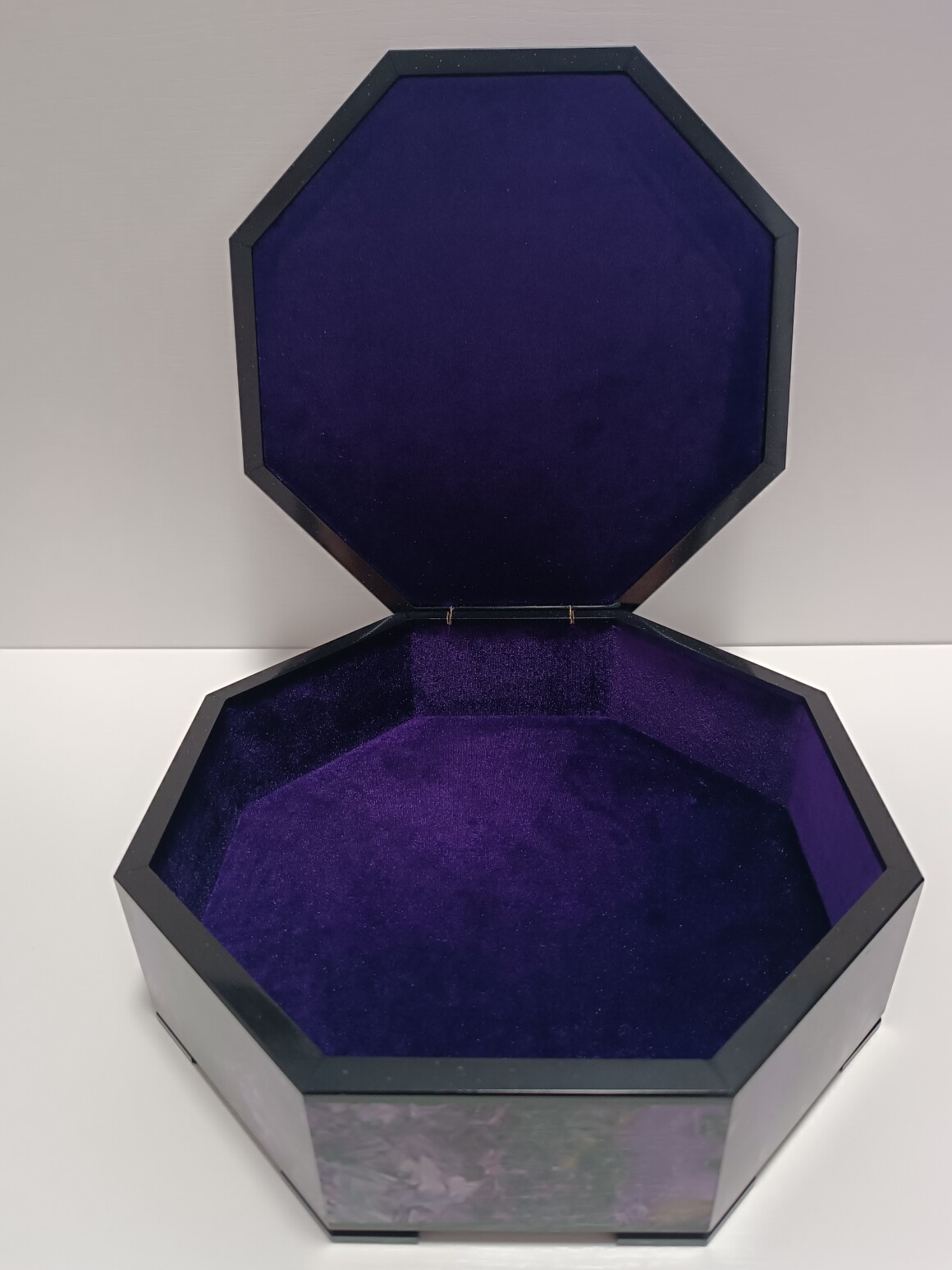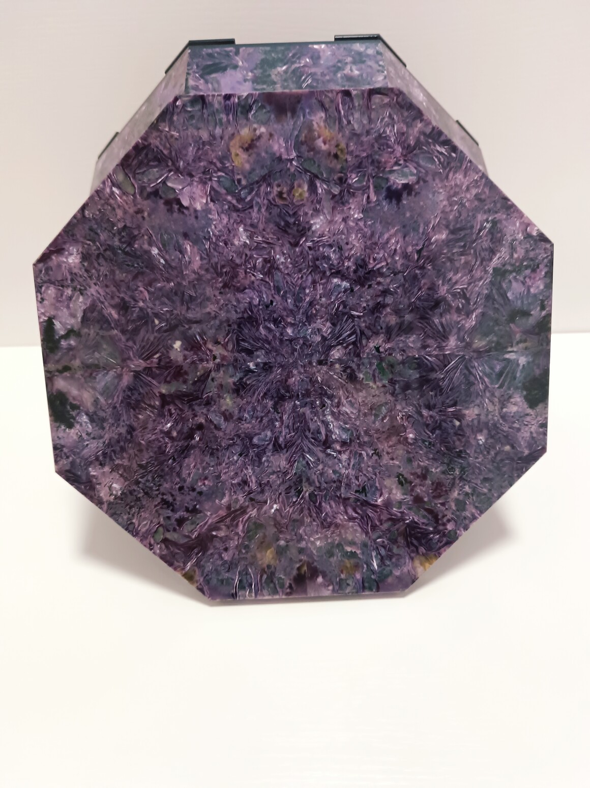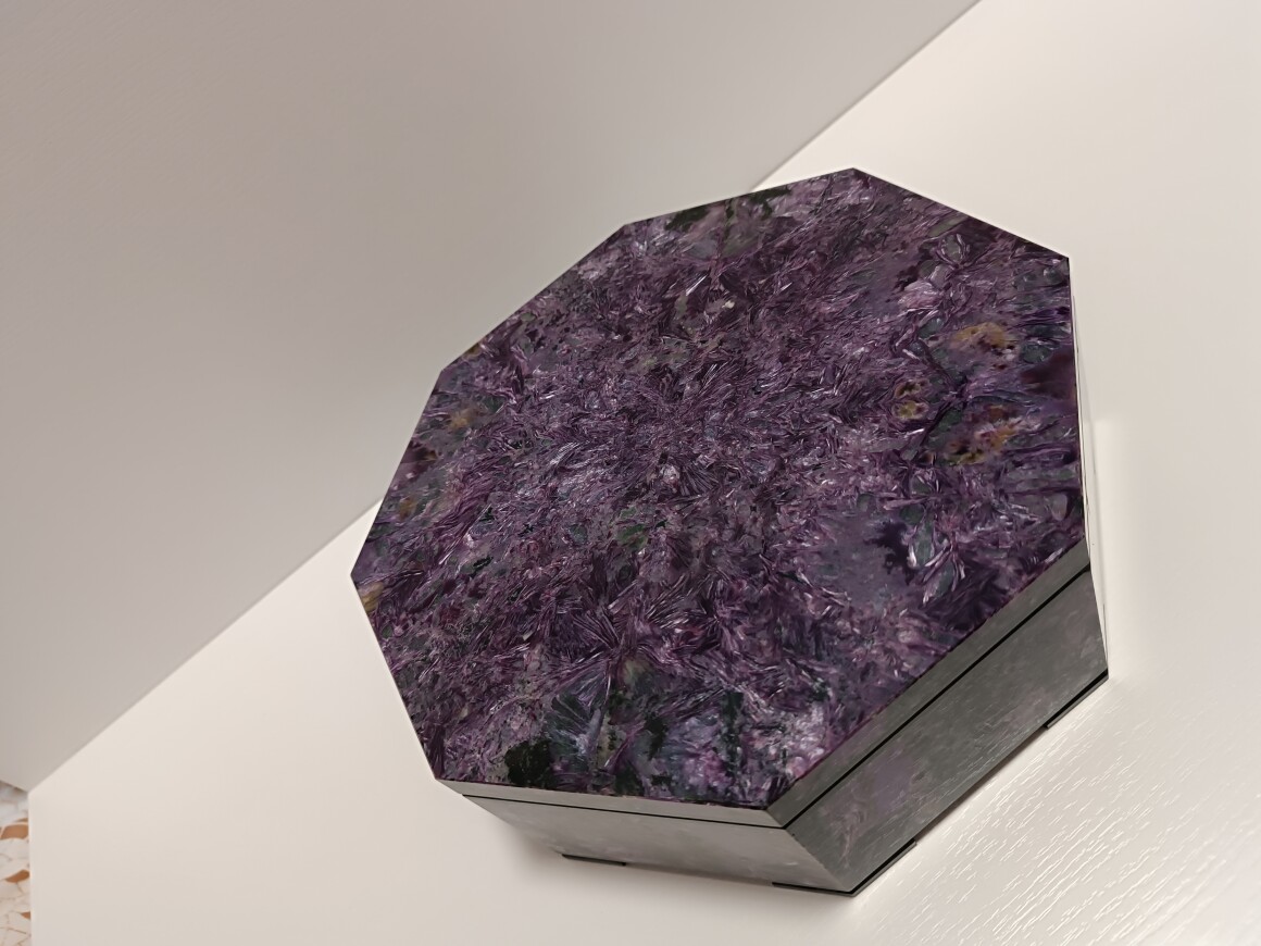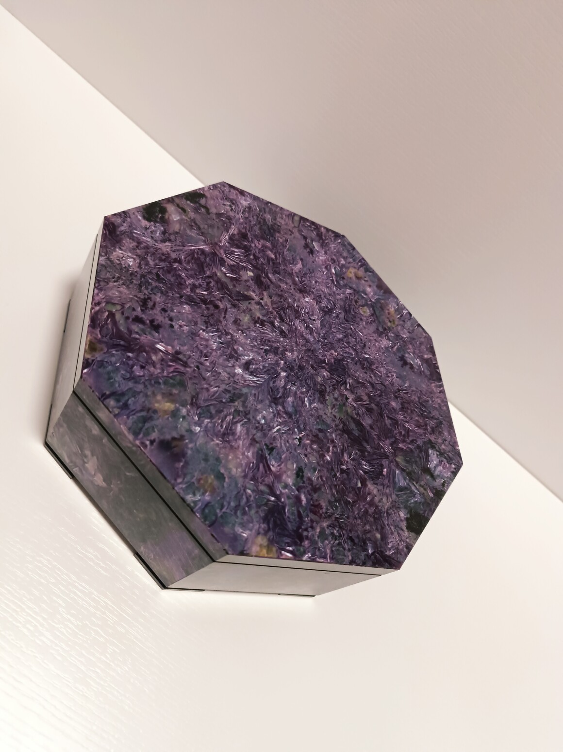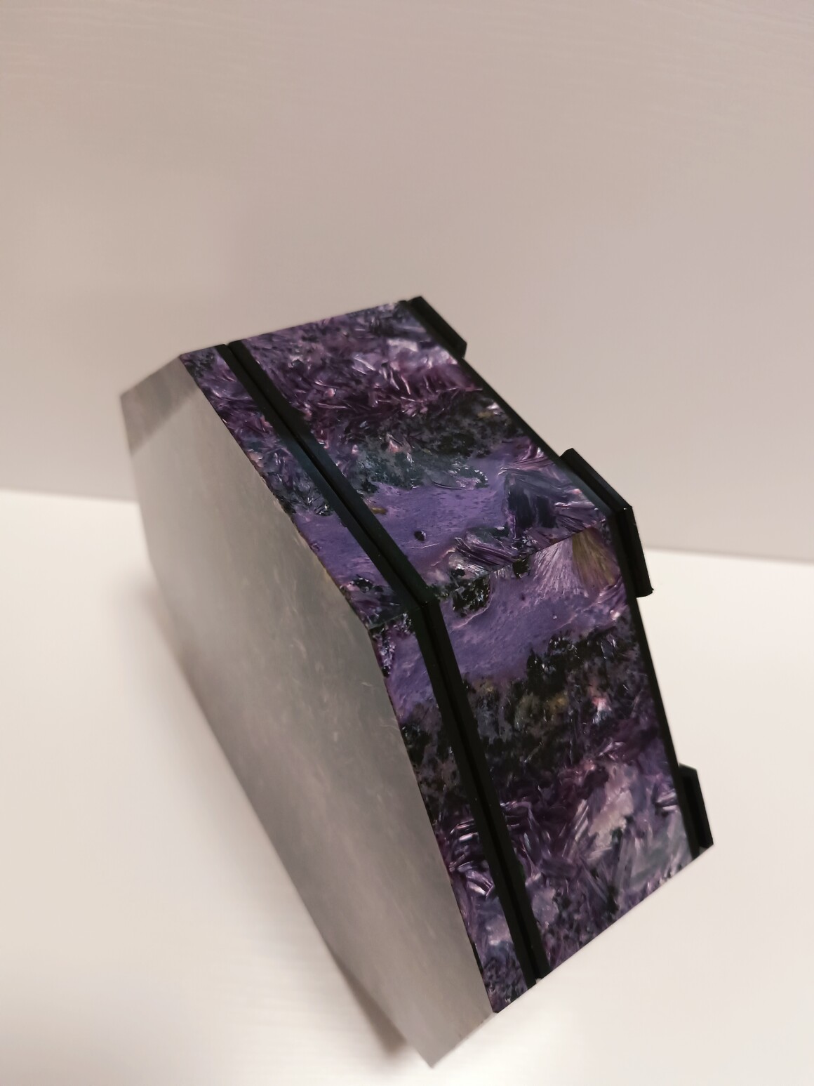 Шкатулка сделана Уральским Мастером из природного чароита. Шкатулка внутри обклеена бархатом. На ножках наклеена специальная ткань чтоб не царапать поверхность. Ножки рамки сделаны из долерита , шарниры из латуни (Ручная работа) Шкатулка вместительная , можно хранить не только ювелирные изделия.