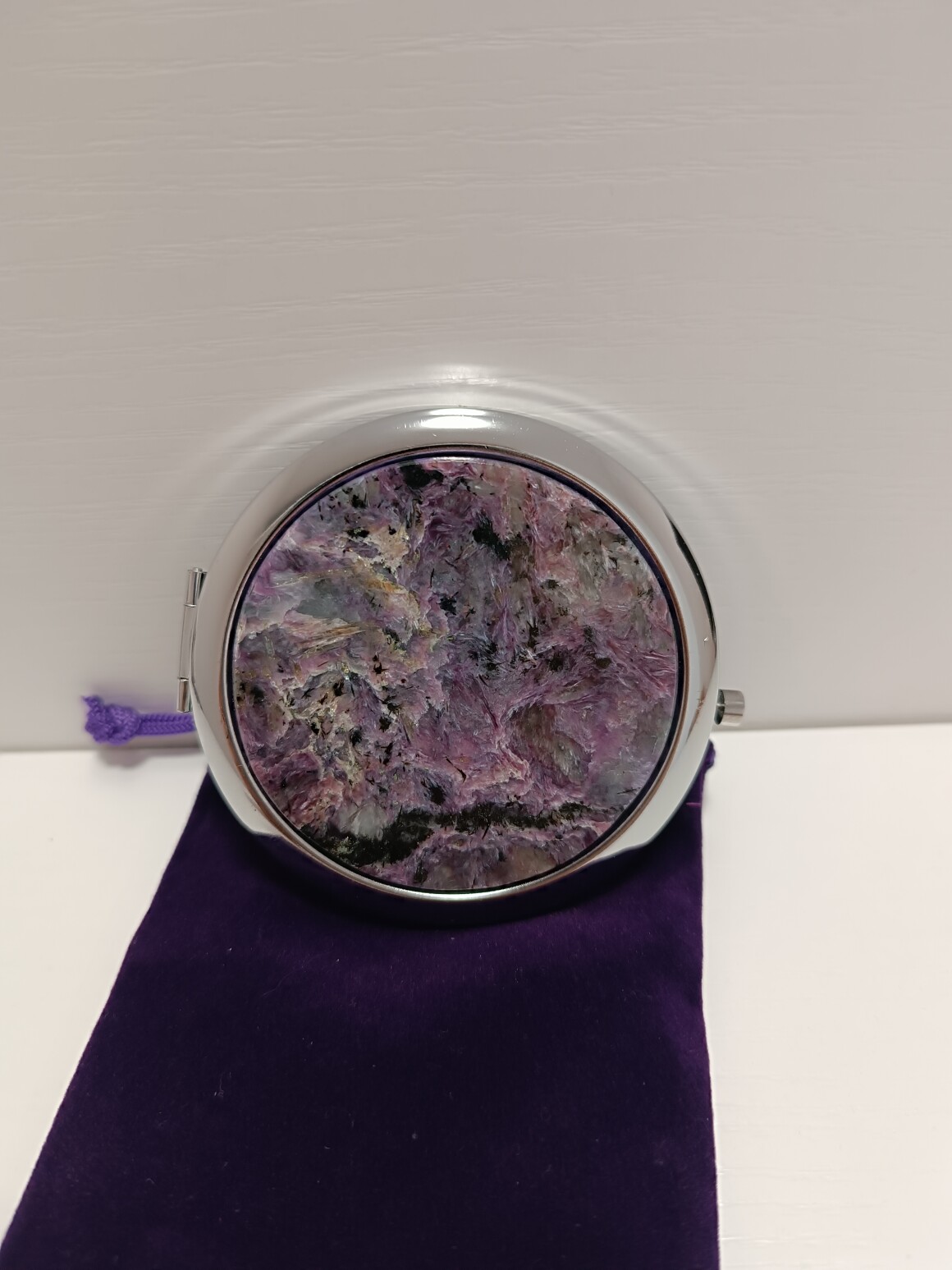 Карманное чароитовое зеркало. Диаметр зеркала 70 мм, толщина 11 мм. Внутри два зеркала одно увеличивает в два раза. Сам корпус металлический цвет серебро сверху сделана и наклеена вставка из природного чароита Уральским Мастером. К зеркалу прилагается чехол .