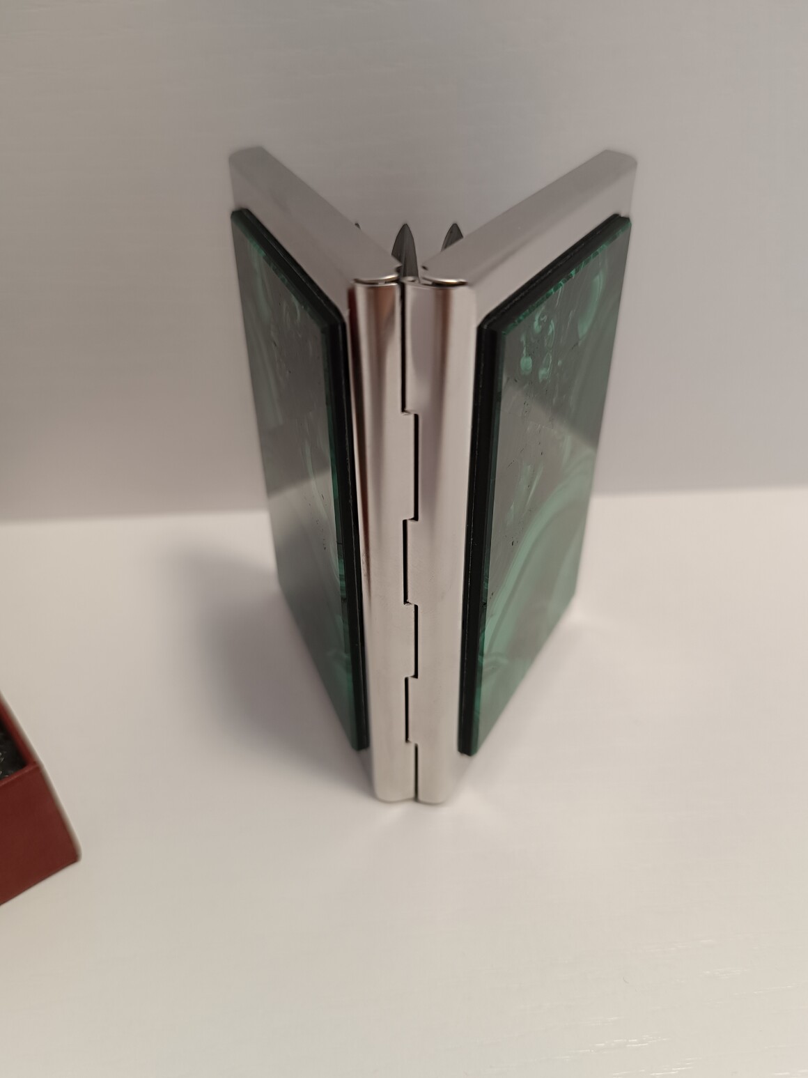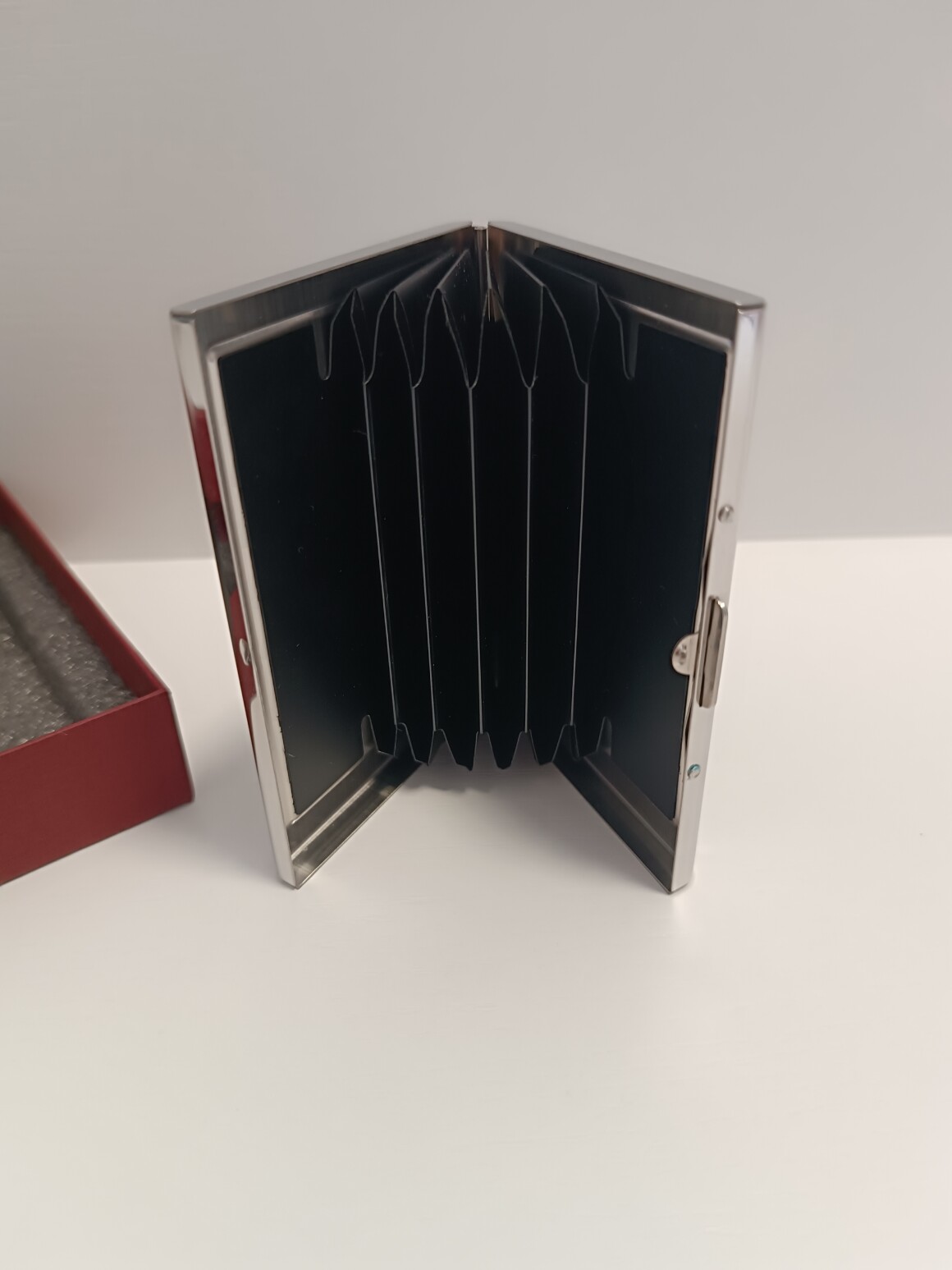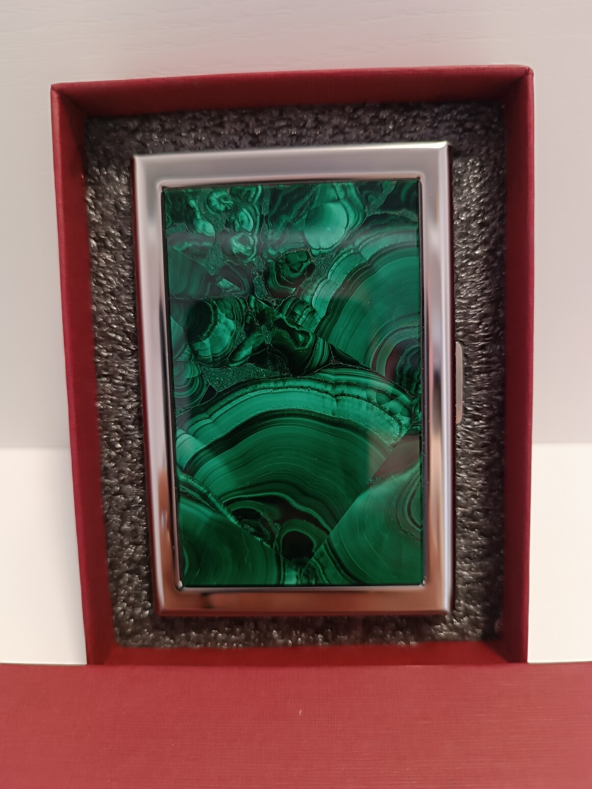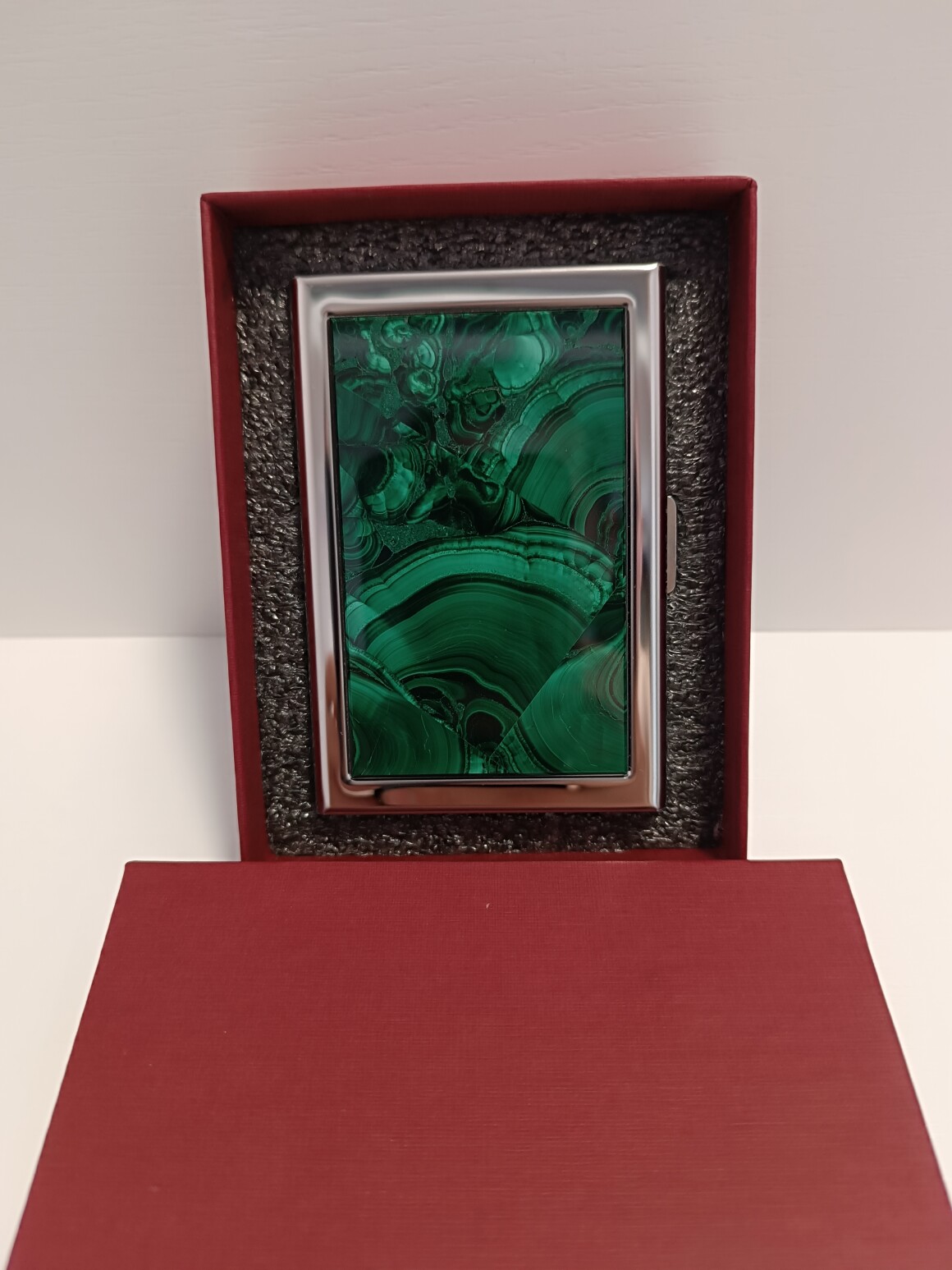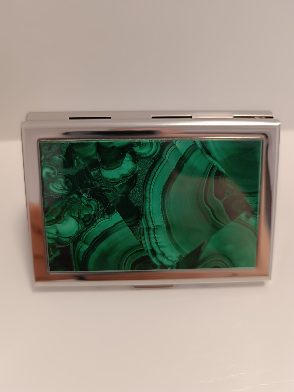 Карманный малахитовый картхолдер. Сам корпус металлический цвет серебро, сверху сделана и наклеена с двух сторон вставки из природного малахита. Внутри 6-отделений для карт.В малахите присутствует Иризация — это оптический эффект, при котором на поверхности минерала появляются радужные переливы и игра света при изменении угла обзора.