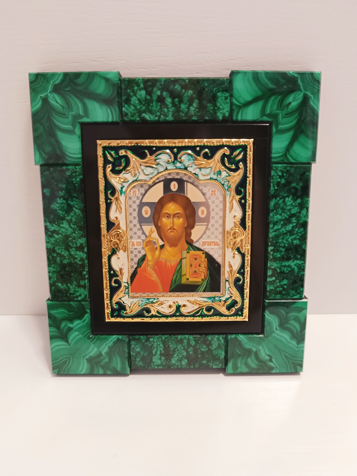 Икона Спасителя — один из центральных образов в православной иконографии.Отражает богословское осмысление личности Иисуса Христа и его роли в спасении человечества. Лик приобретен в церковной лавке,рамка для лика сделана из природного малахита.