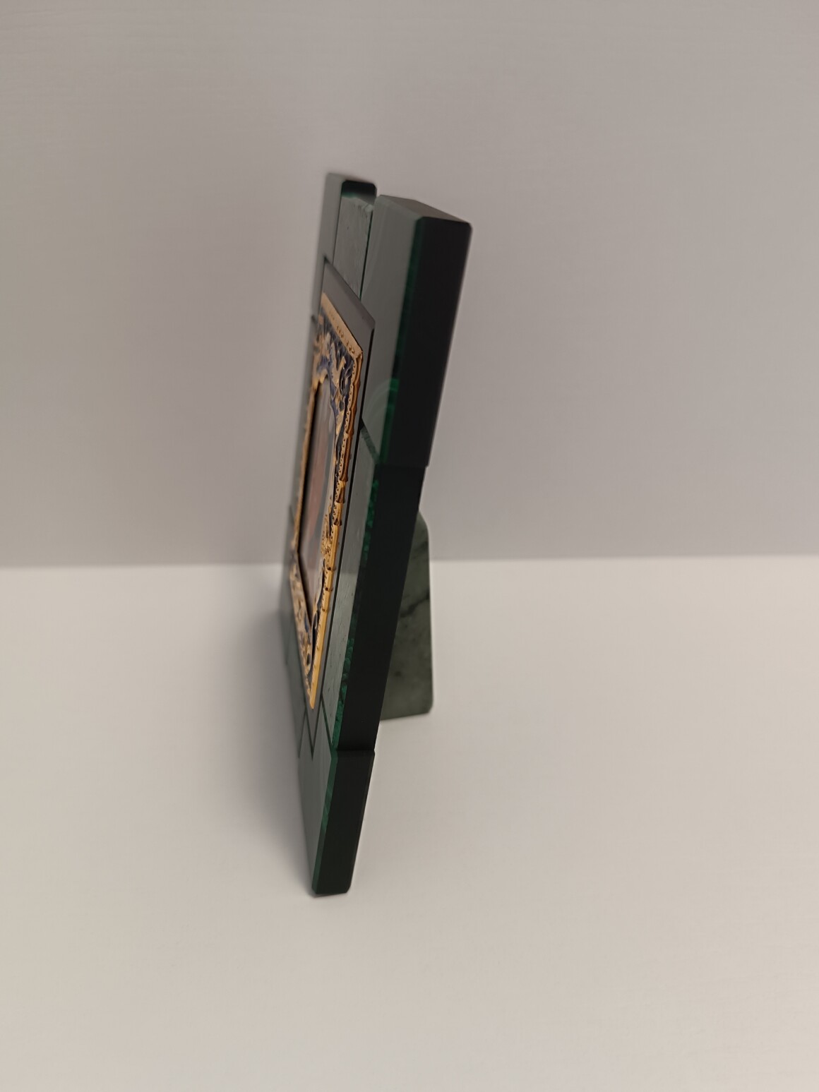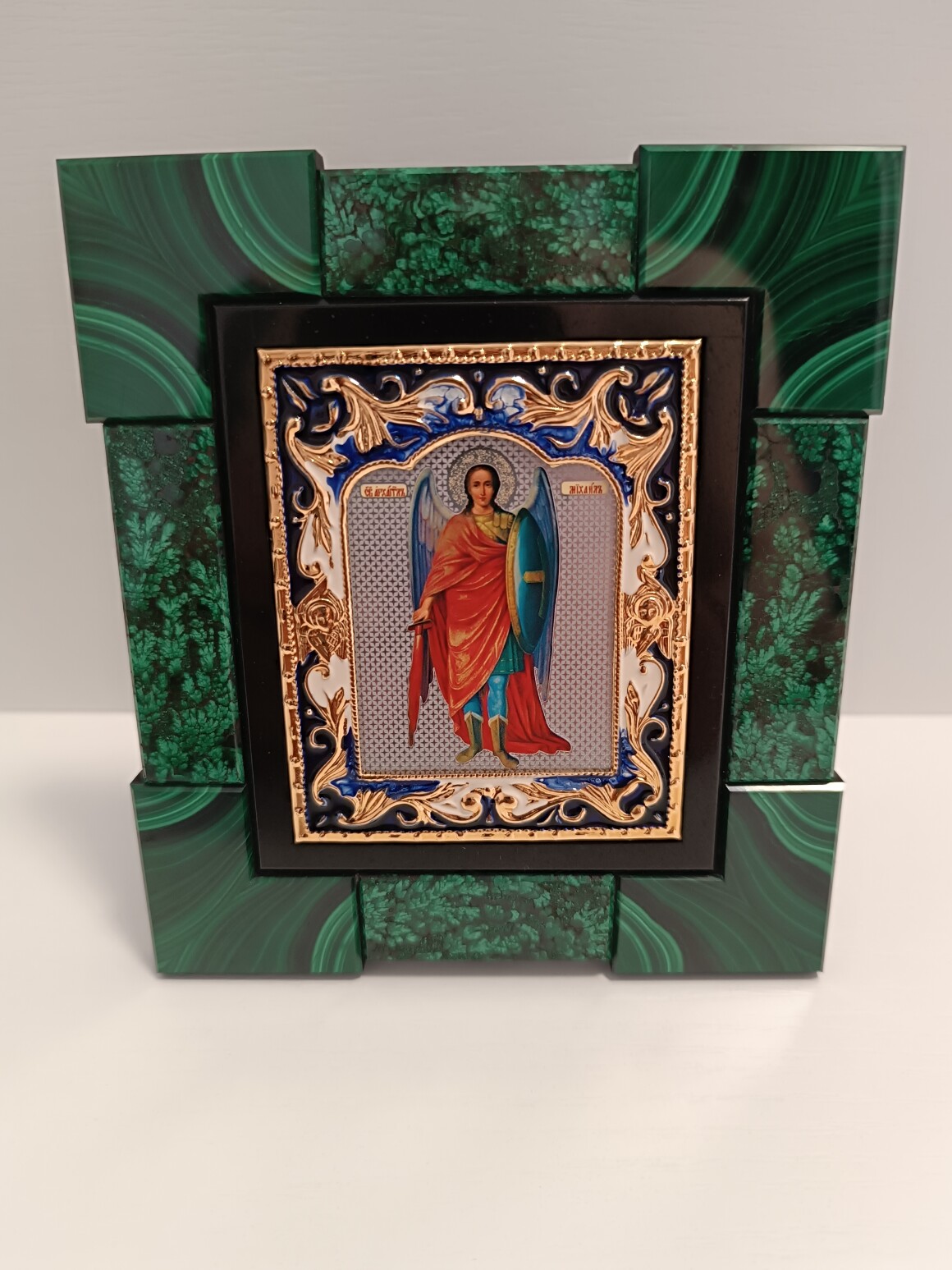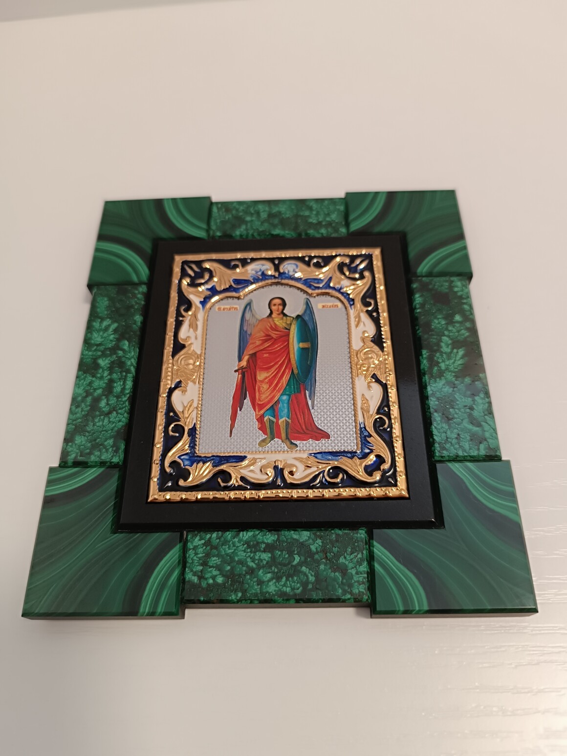 Архангел Михаил — один из самых почитаемых ангелов в авраамических религиях (христианстве, иудаизме, исламе). В православии его называют Архистратигом — то есть главнокомандующим небесного воинства. Лик приобретен в церковной лавке,рамка для лика сделана из природного малахита. Икону можно ставить на стол ,ножка убирается и можно вешать на стену.