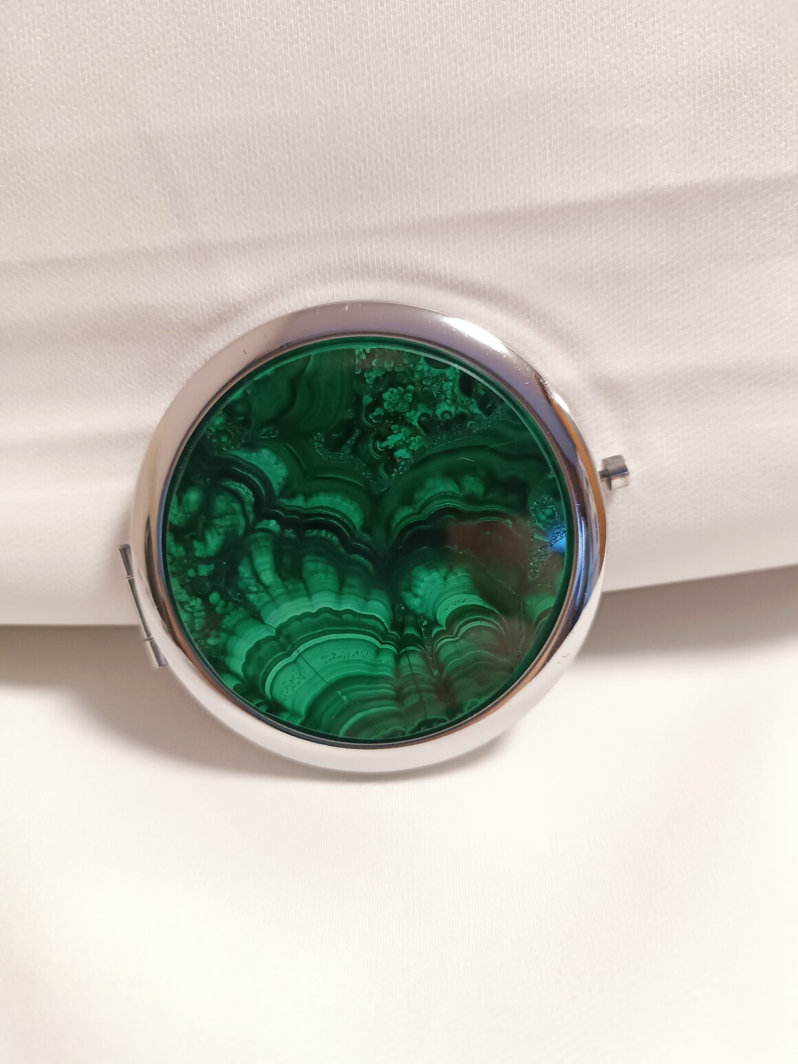 Карманное малахитовое зеркало. Диаметр зеркала 70 мм, толщина 11 мм. Внутри два зеркала одно увеличивает в два раза. Сам корпус металлический цвет серебро сверху сделана и наклеена вставка из природного малахита Уральским Мастером