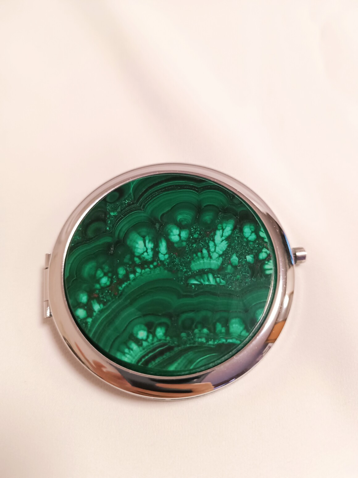 Карманное малахитовое зеркало. Диаметр зеркала 70 мм, толщина 11 мм. Внутри два зеркала одно увеличивает в два раза. Сам корпус металлический цвет серебро сверху сделана и наклеена вставка из природного малахита Уральским Мастером