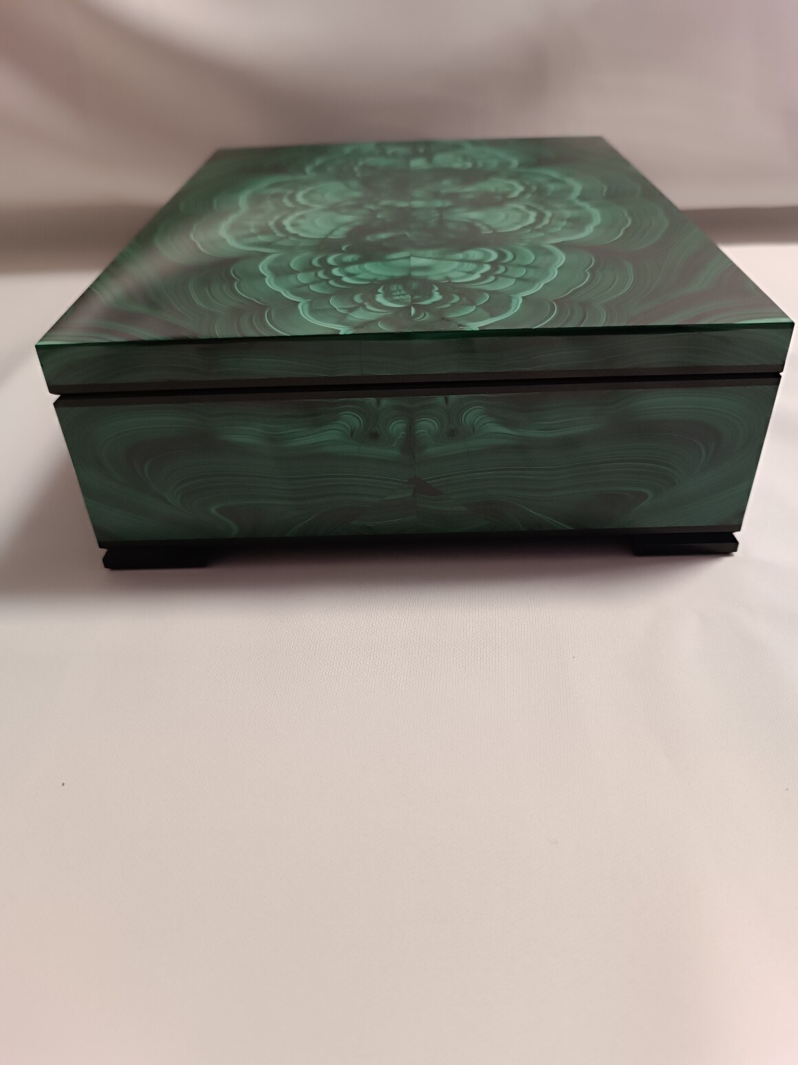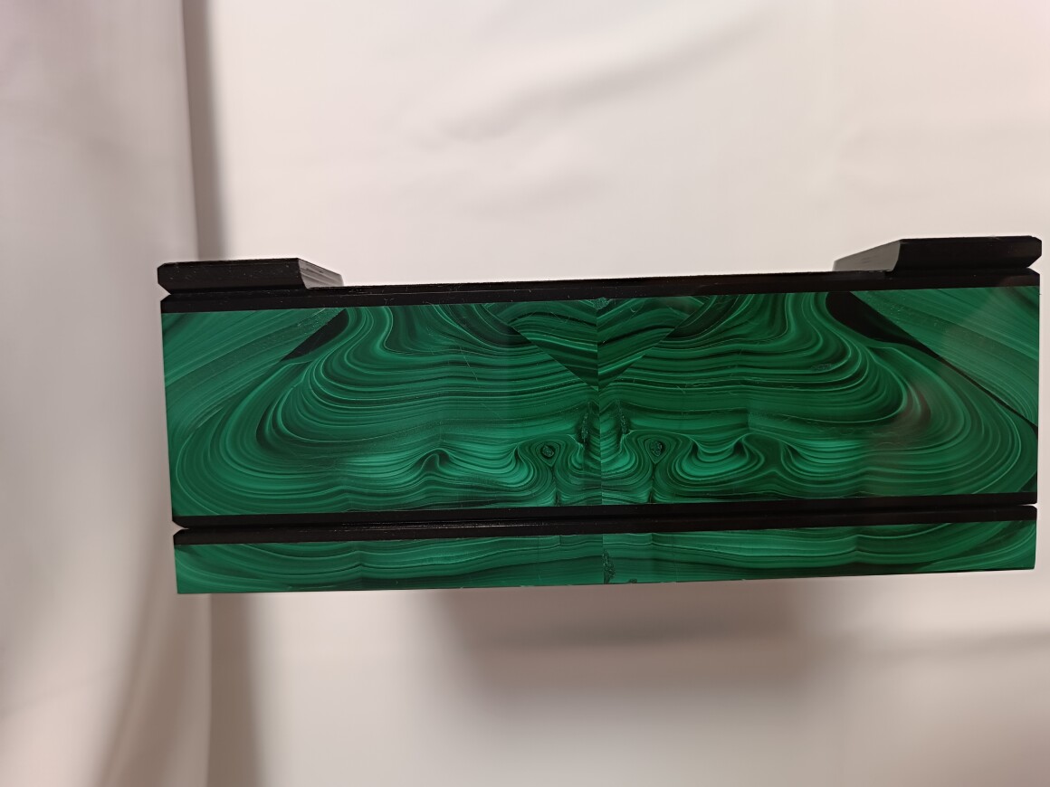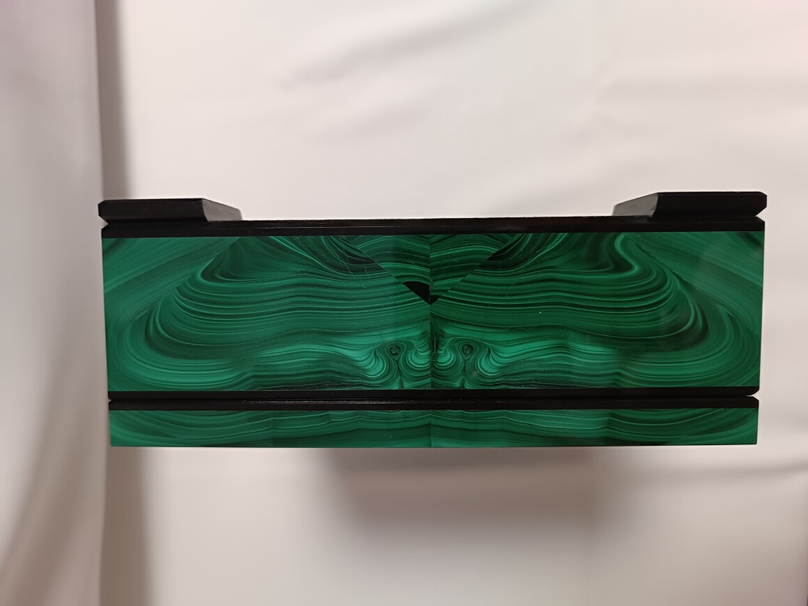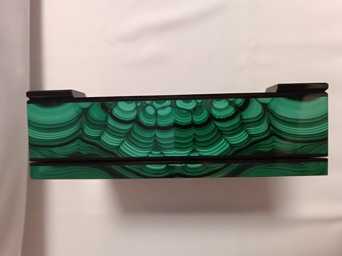 Шкатулка сделана Уральским Мастером из природного малахита.Размер шкатулки 250-200-75 мм . Шкатулка внутри обклеена зеленым бархатом. На ножках наклеена специальная ткань чтоб не царапать поверхность. Ножки рамки сделаны из долерита , шарниры из латуни (Ручная работа) Шкатулка вместительная , можно хранить не только ювелирные изделия.