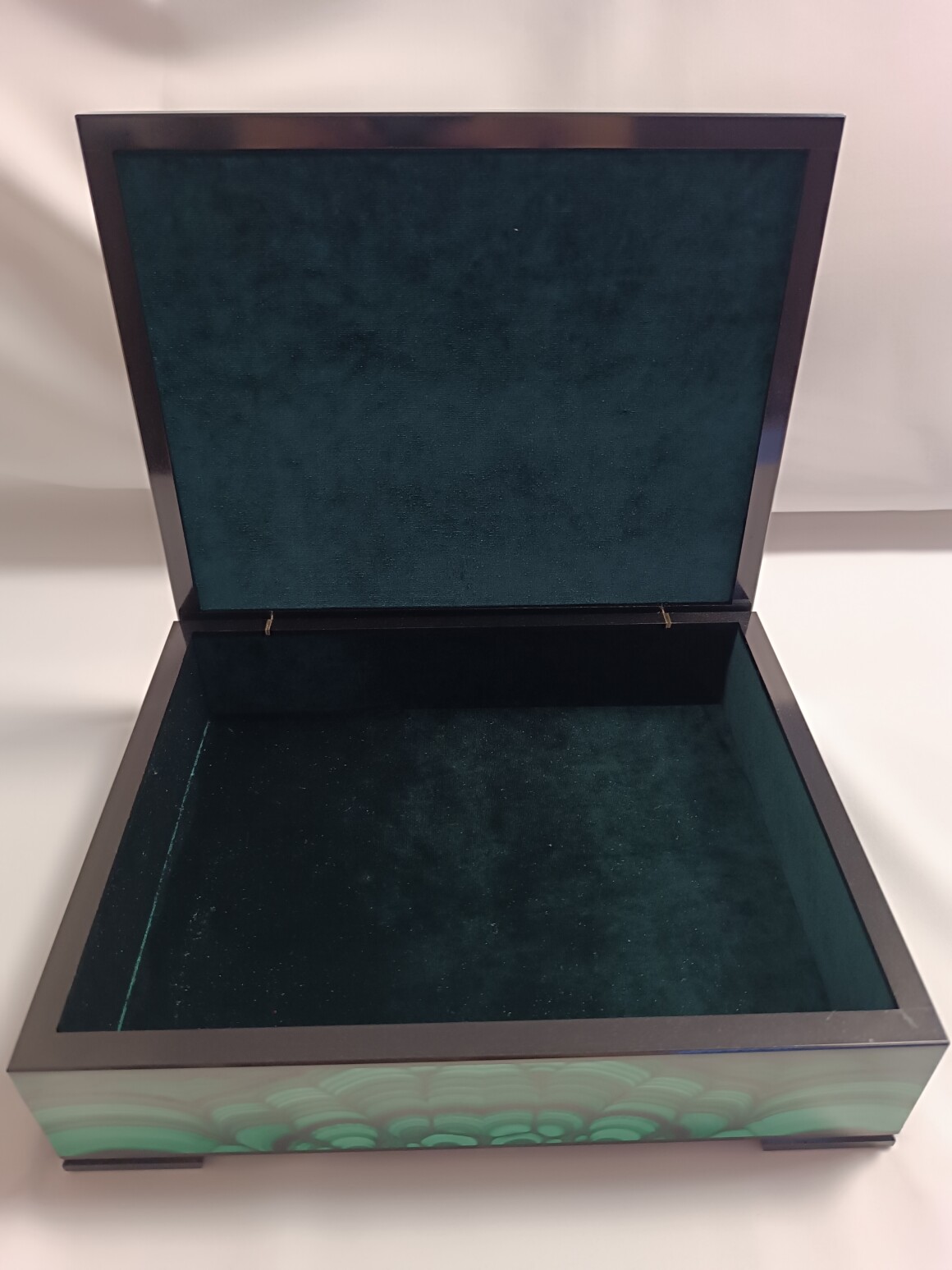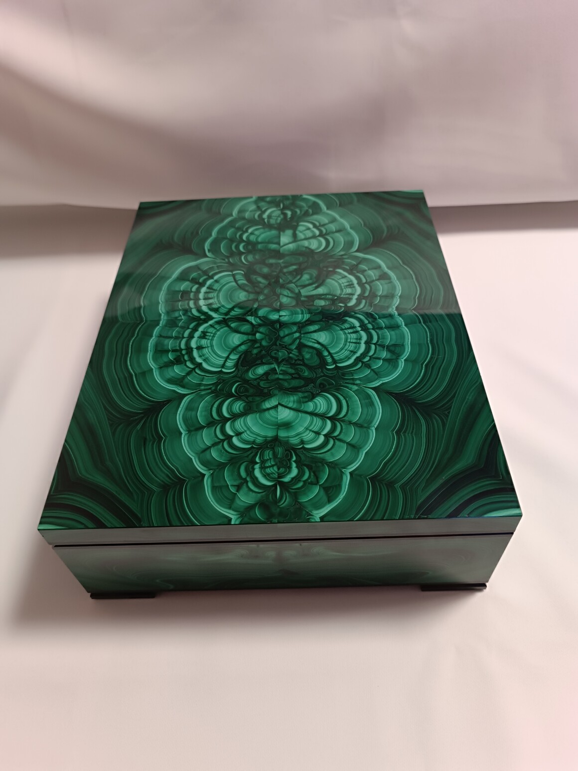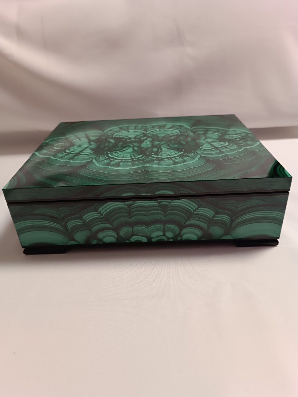 Шкатулка сделана Уральским Мастером из природного малахита.Размер шкатулки 250-200-75 мм . Шкатулка внутри обклеена зеленым бархатом. На ножках наклеена специальная ткань чтоб не царапать поверхность. Ножки рамки сделаны из долерита , шарниры из латуни (Ручная работа) Шкатулка вместительная , можно хранить не только ювелирные изделия.