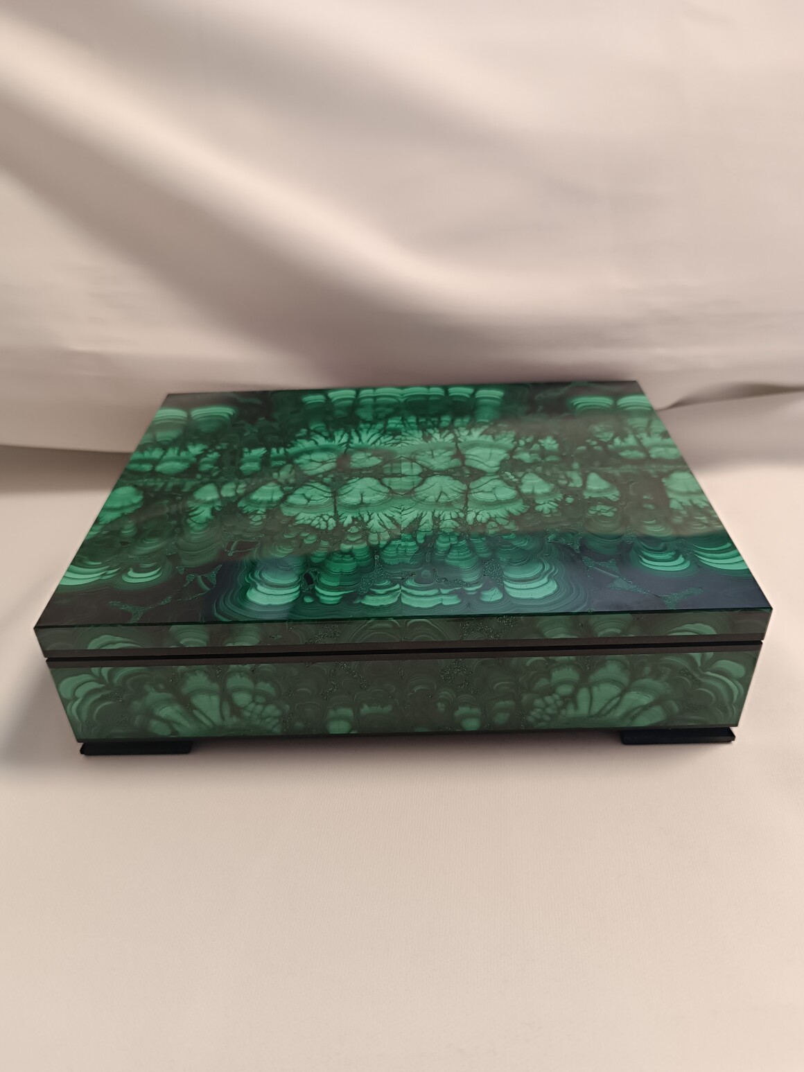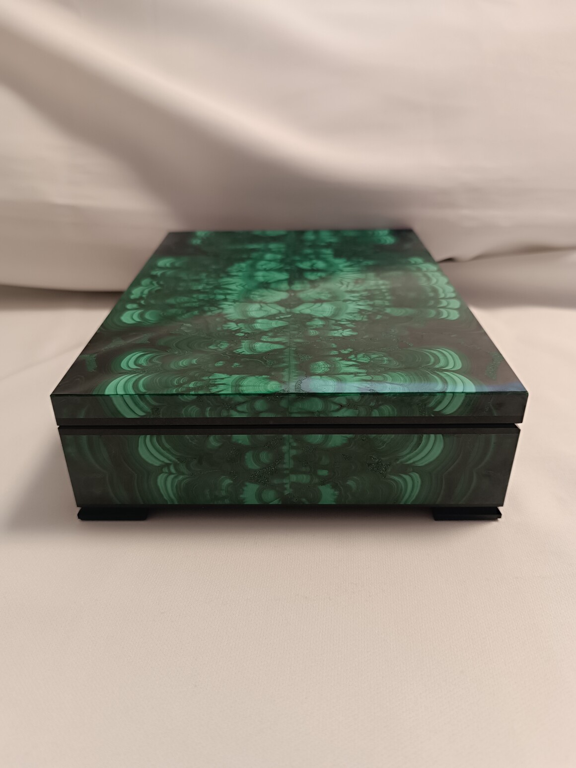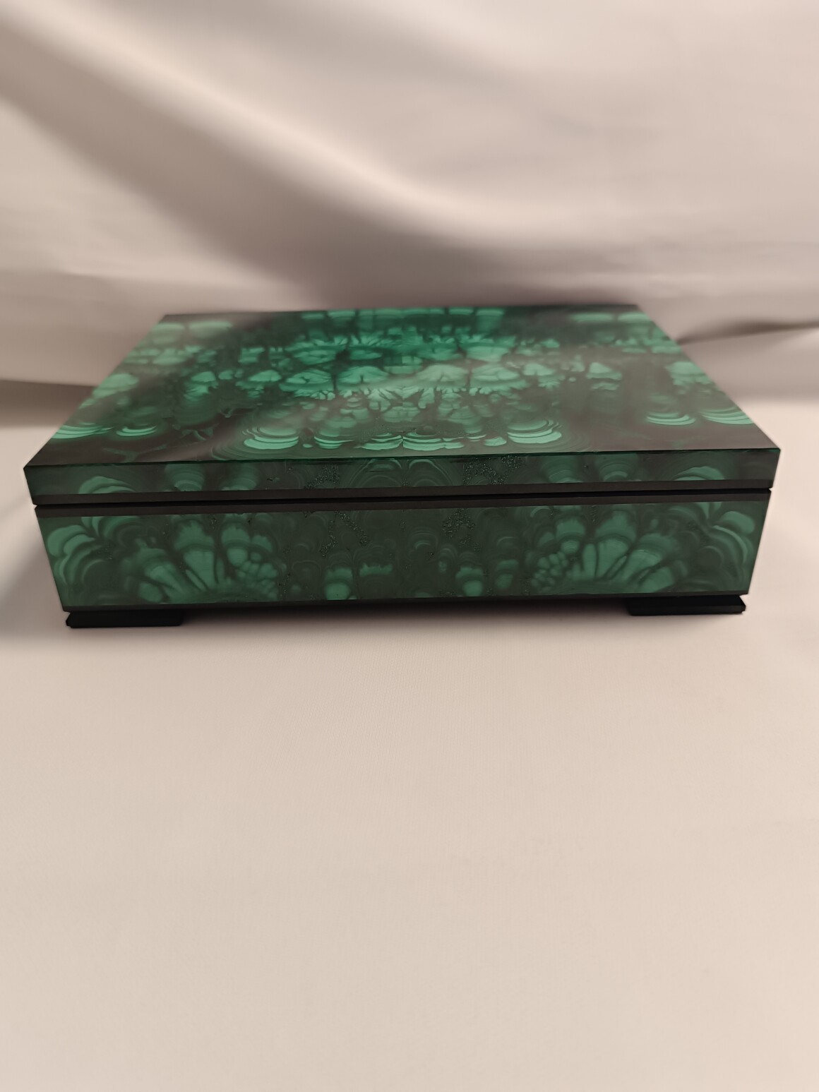 Шкатулка сделана Уральским Мастером из природного малахита.Размер шкатулки 200-150-52 мм . Шкатулка внутри обклеена зеленым бархатом. На ножках наклеена специальная ткань чтоб не царапать поверхность. Ножки рамки сделаны из долерита , шарниры из латуни (Ручная работа) Шкатулка вместительная , можно хранить не только ювелирные изделия.