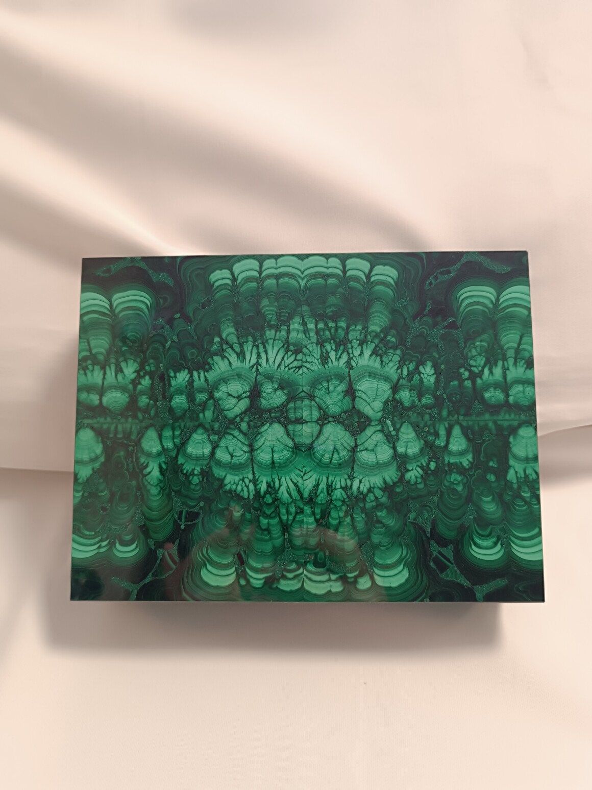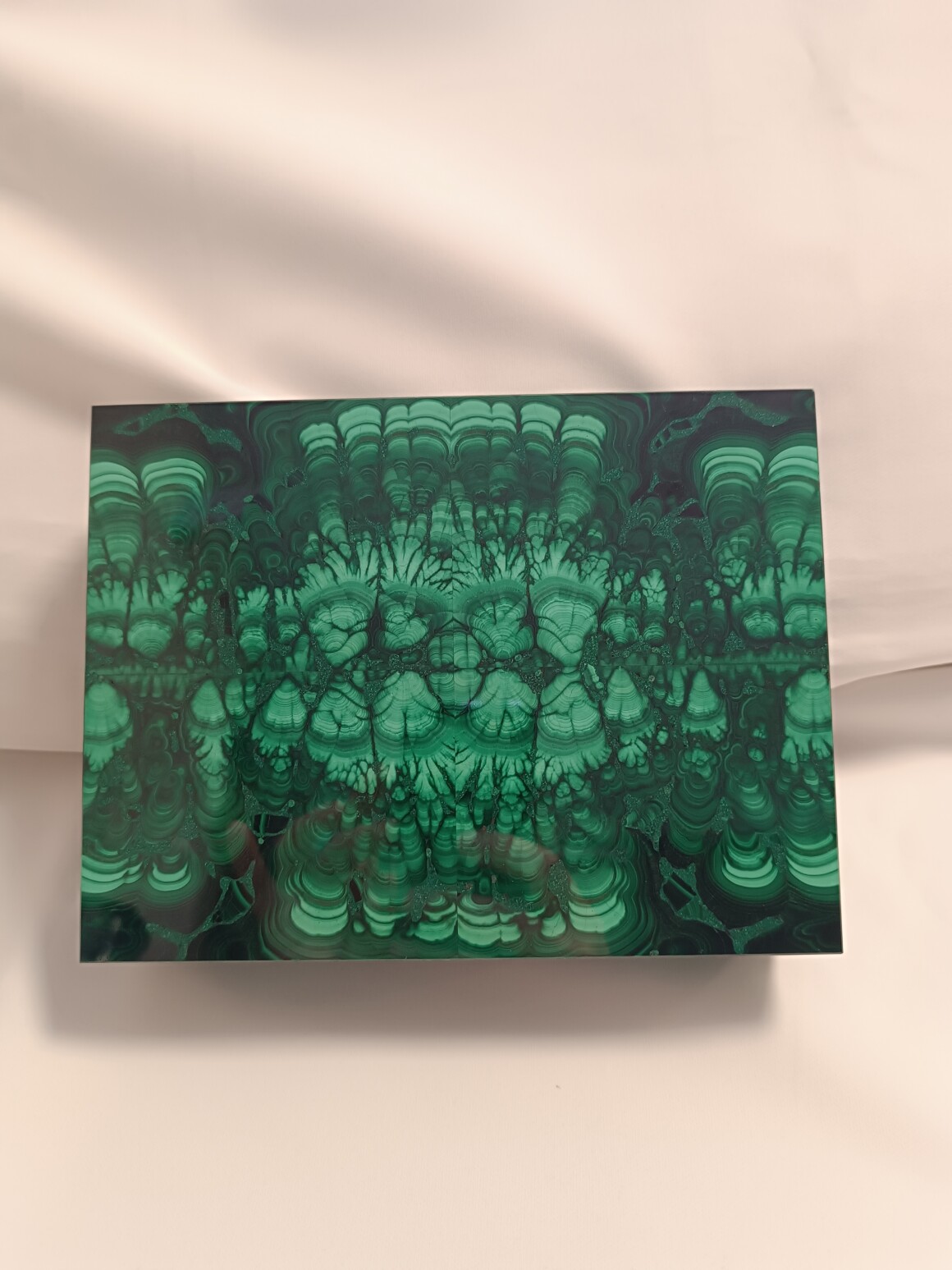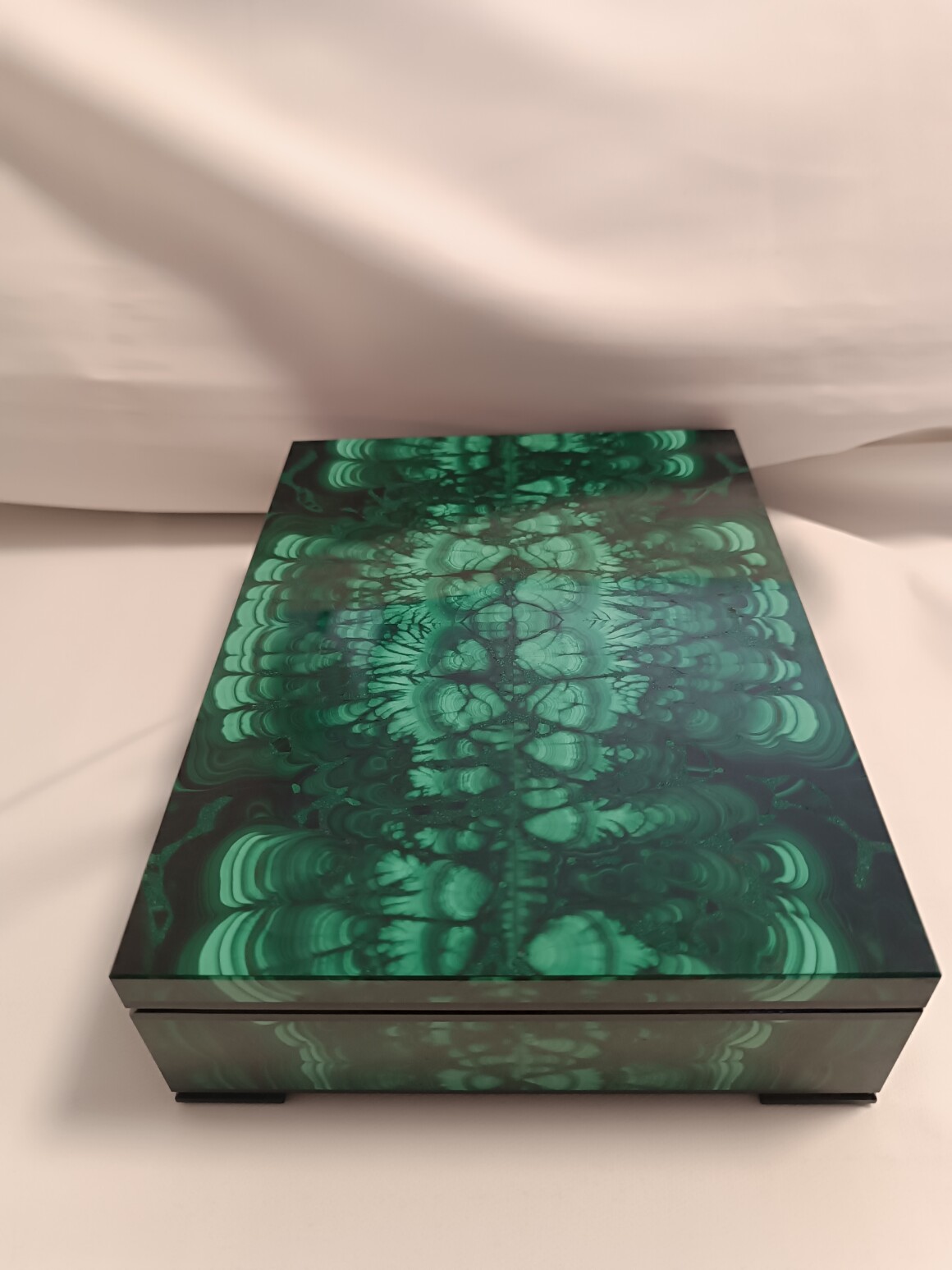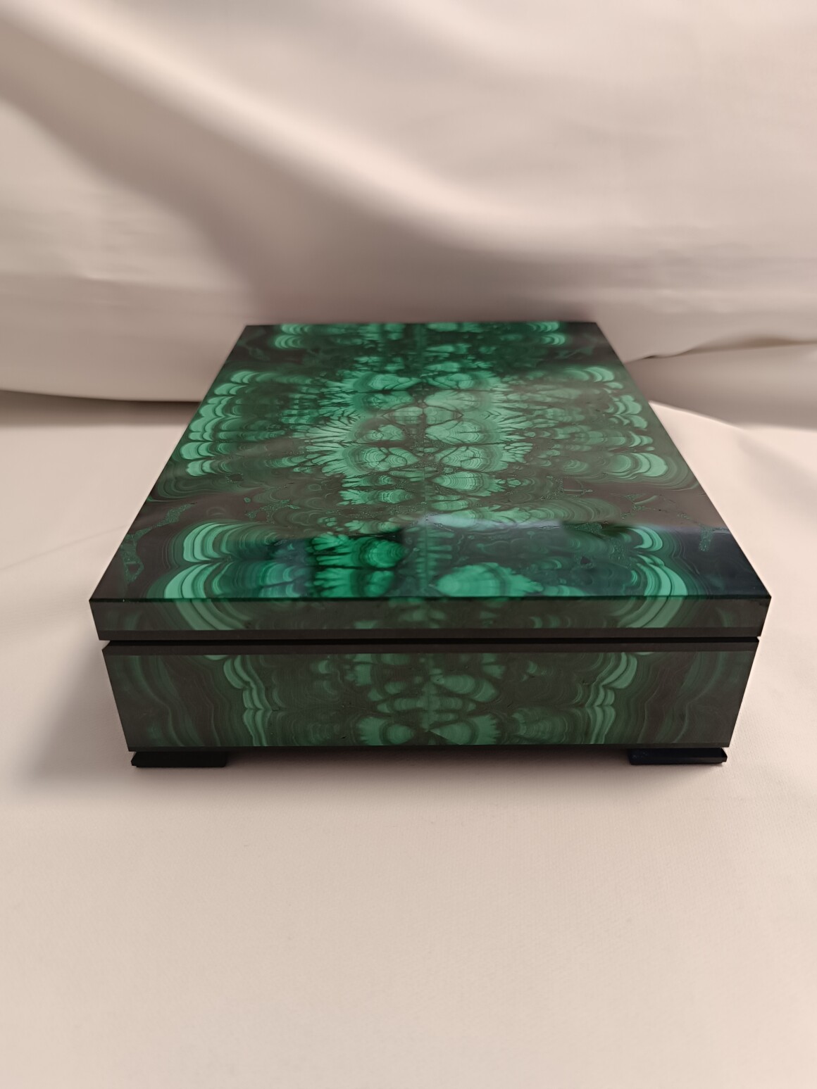 Шкатулка сделана Уральским Мастером из природного малахита.Размер шкатулки 200-150-52 мм . Шкатулка внутри обклеена зеленым бархатом. На ножках наклеена специальная ткань чтоб не царапать поверхность. Ножки рамки сделаны из долерита , шарниры из латуни (Ручная работа) Шкатулка вместительная , можно хранить не только ювелирные изделия.