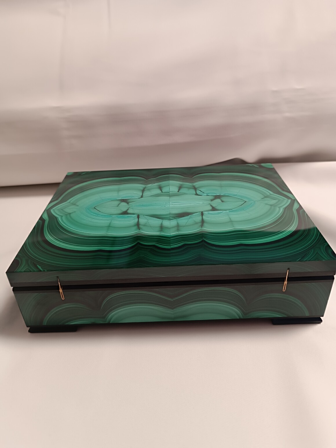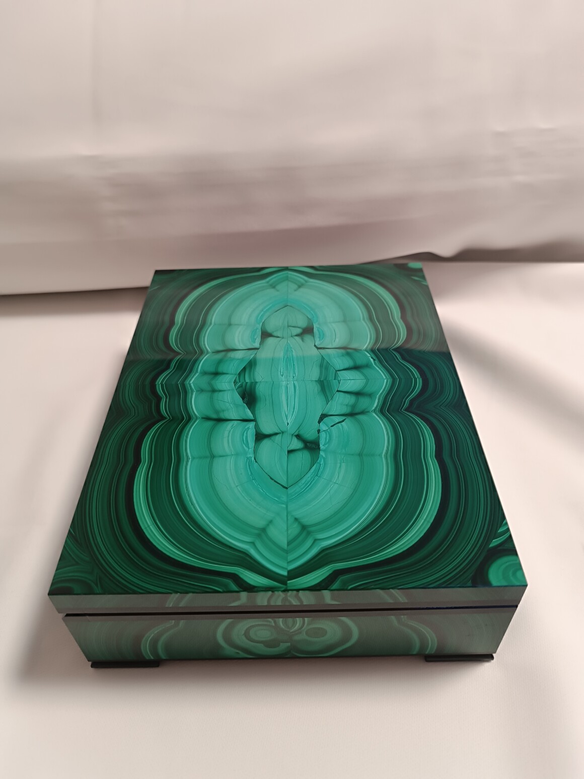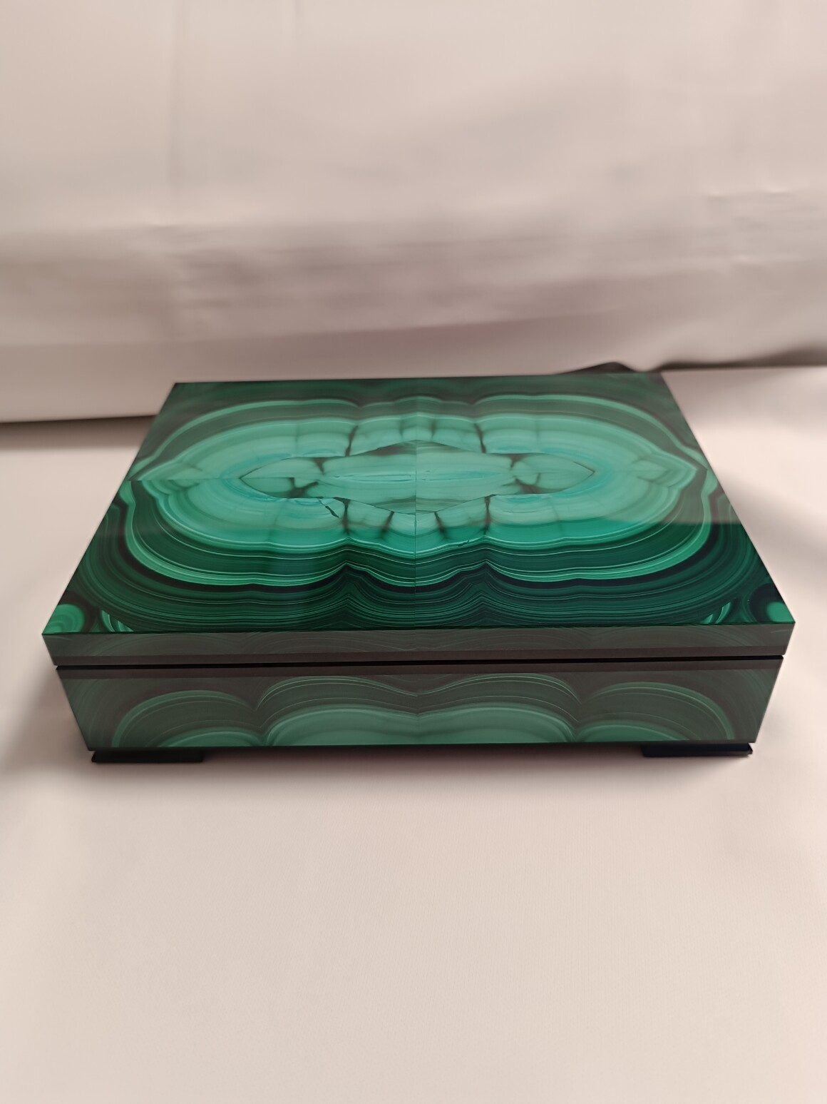 Шкатулка сделана Уральским Мастером из природного малахита.Размер шкатулки 200-150-55 мм . Шкатулка внутри обклеена зеленым бархатом. На ножках наклеена специальная ткань чтоб не царапать поверхность. Ножки рамки сделаны из долерита , шарниры из латуни (Ручная работа) Шкатулка вместительная , можно хранить не только ювелирные изделия.