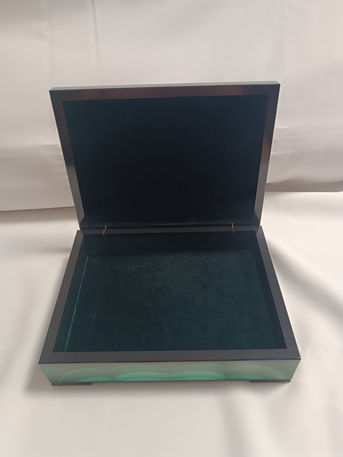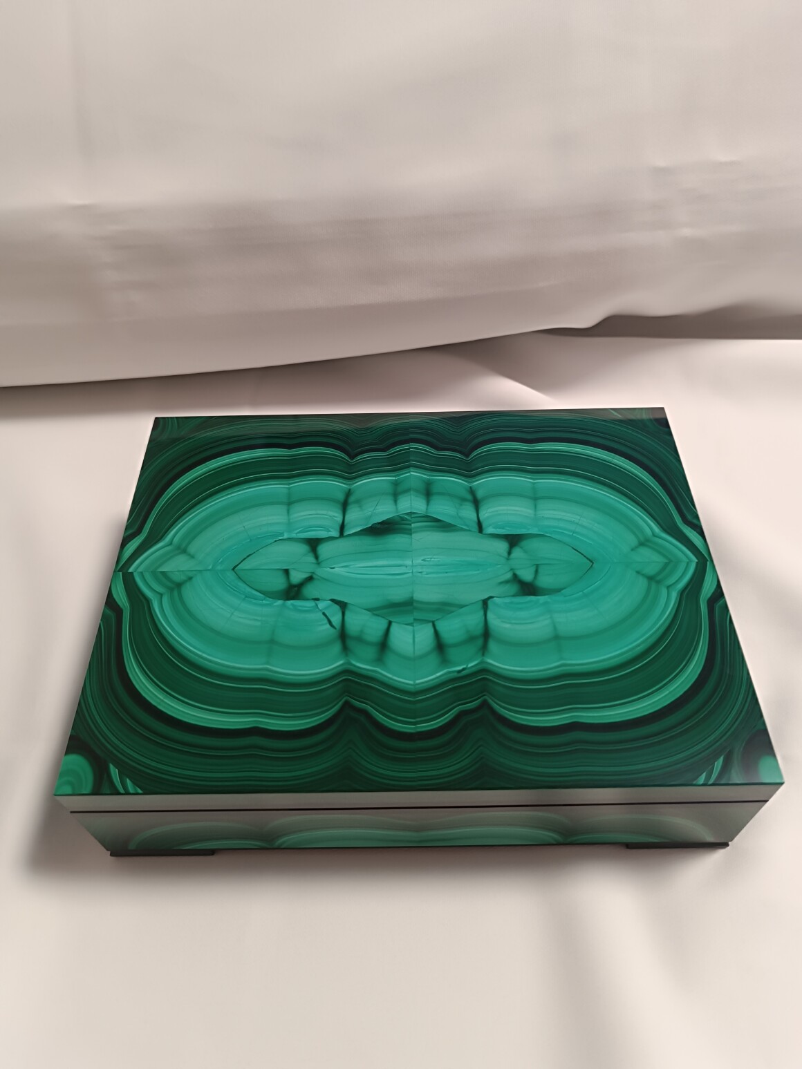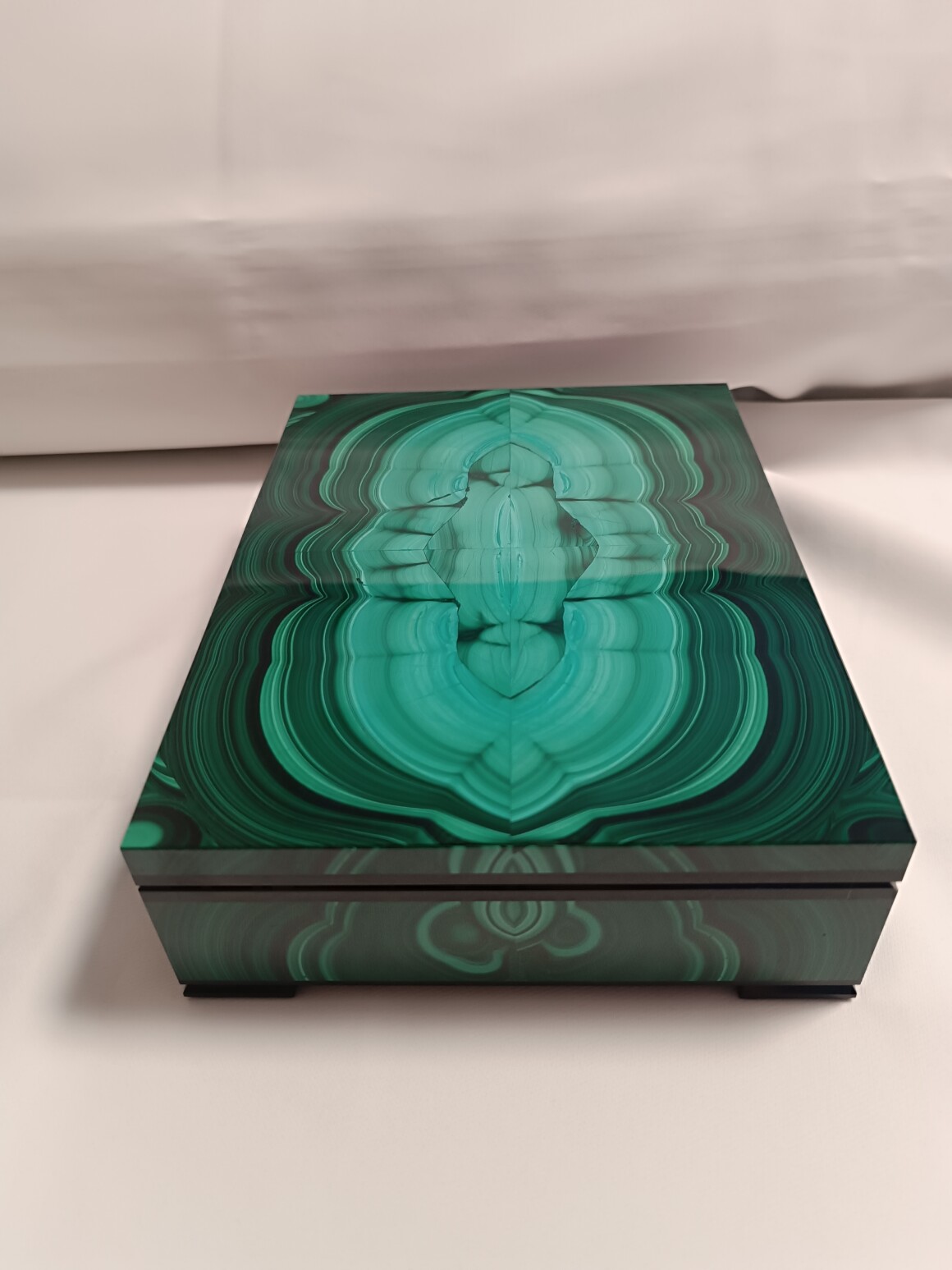 Шкатулка сделана Уральским Мастером из природного малахита.Размер шкатулки 200-150-55 мм . Шкатулка внутри обклеена зеленым бархатом. На ножках наклеена специальная ткань чтоб не царапать поверхность. Ножки рамки сделаны из долерита , шарниры из латуни (Ручная работа) Шкатулка вместительная , можно хранить не только ювелирные изделия.