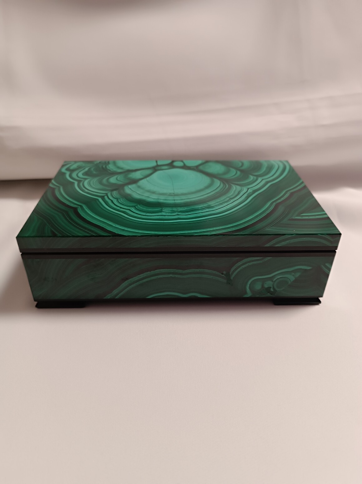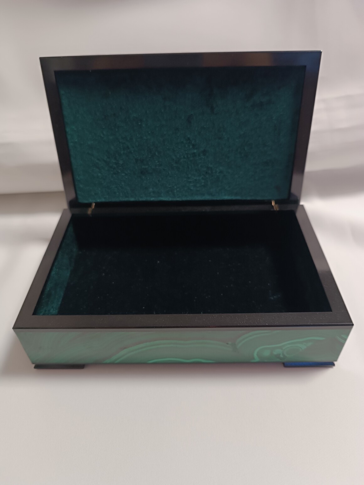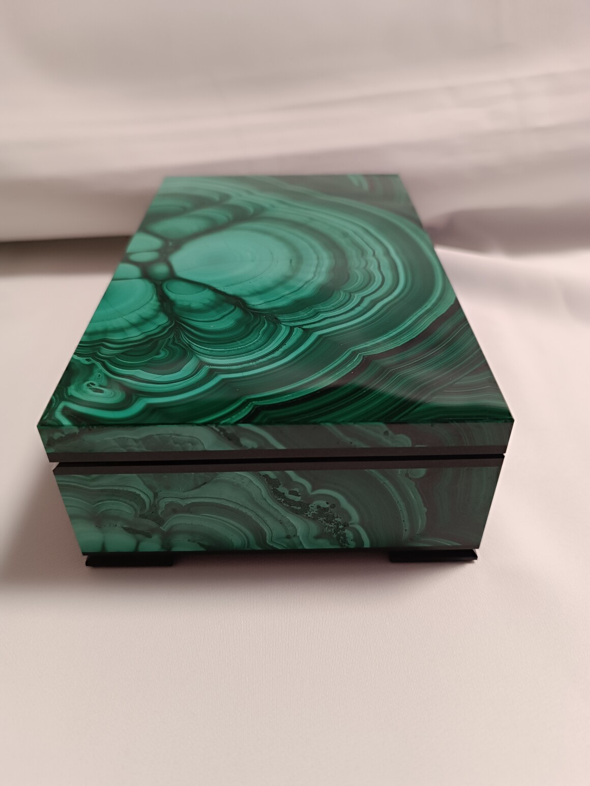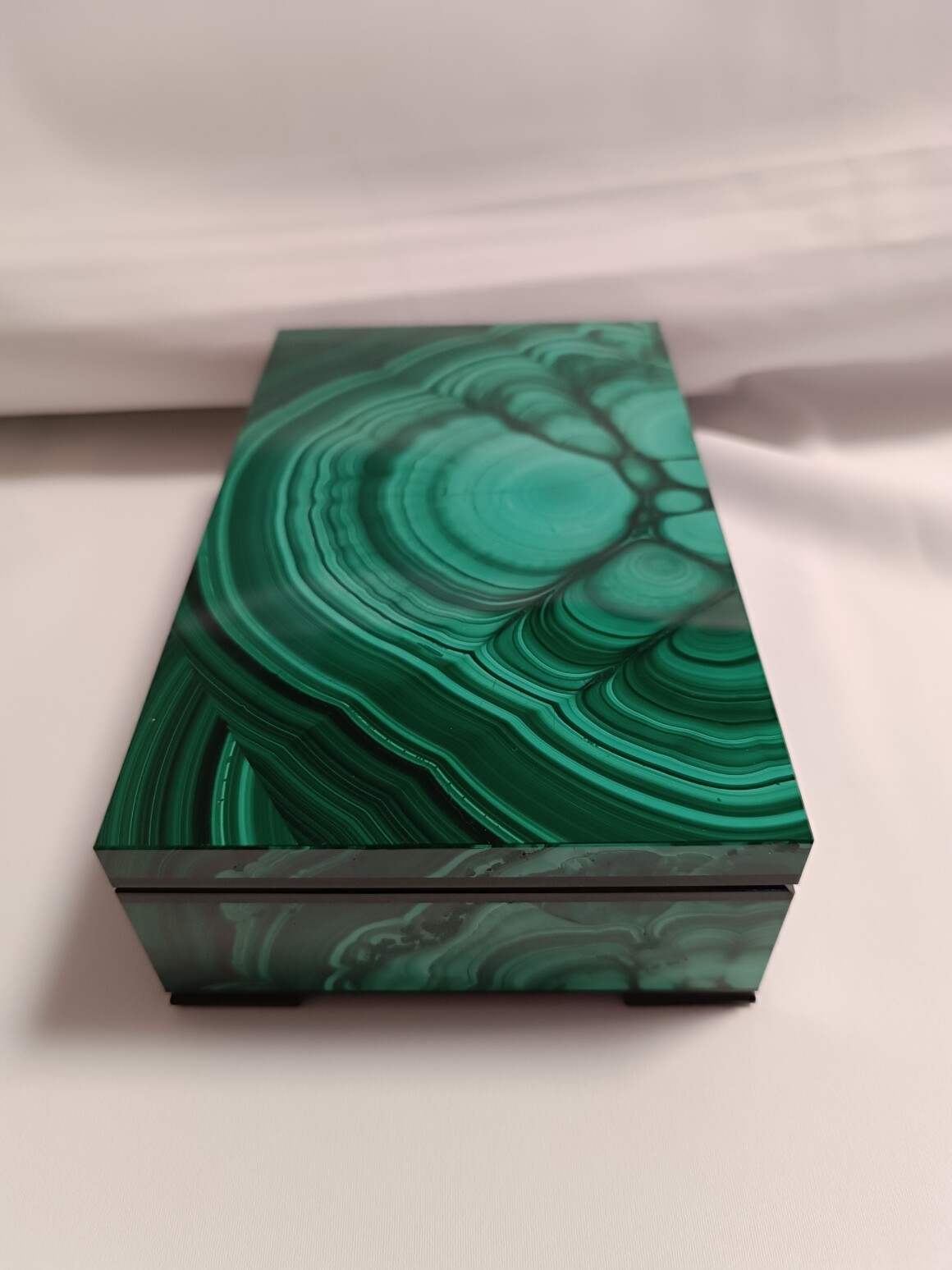 Шкатулка сделана Уральским Мастером из природного малахита.Размер шкатулки 173-103-53 мм . Шкатулка внутри обклеена зеленым бархатом. На ножках наклеена специальная ткань чтоб не царапать поверхность. Ножки рамки сделаны из долерита , шарниры из латуни (Ручная работа)