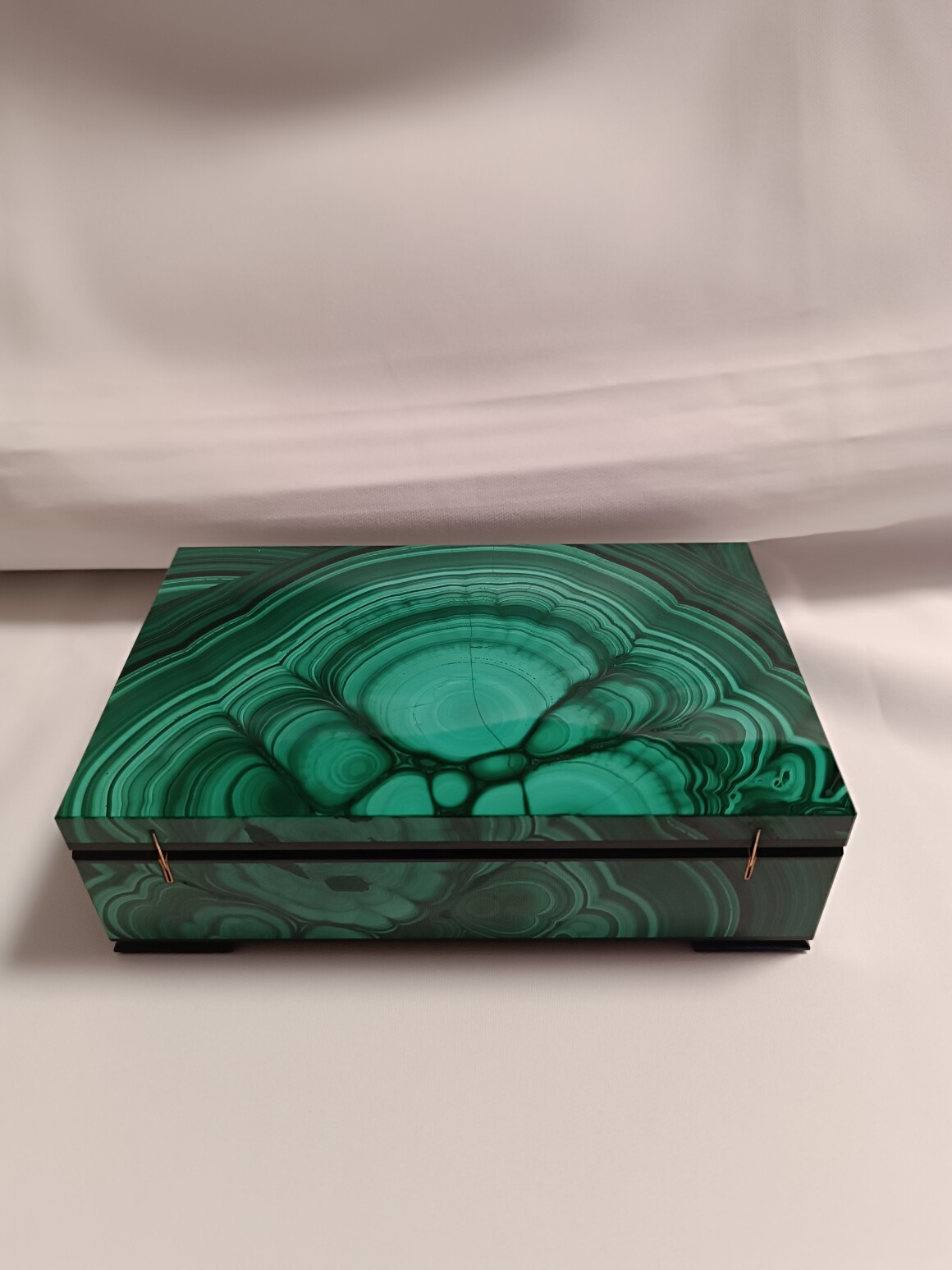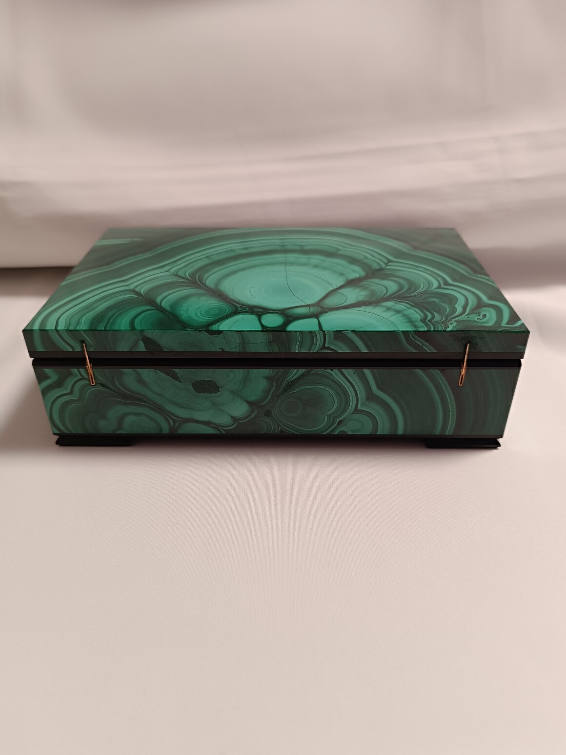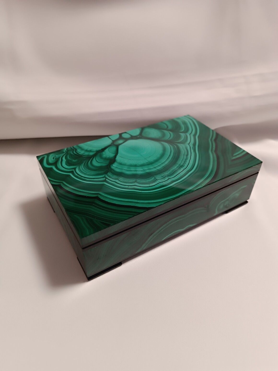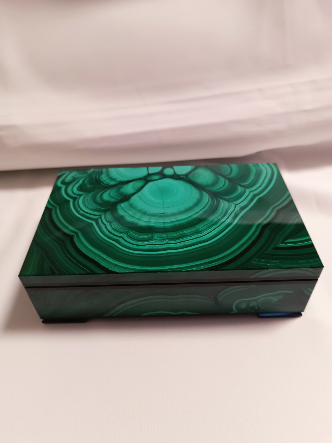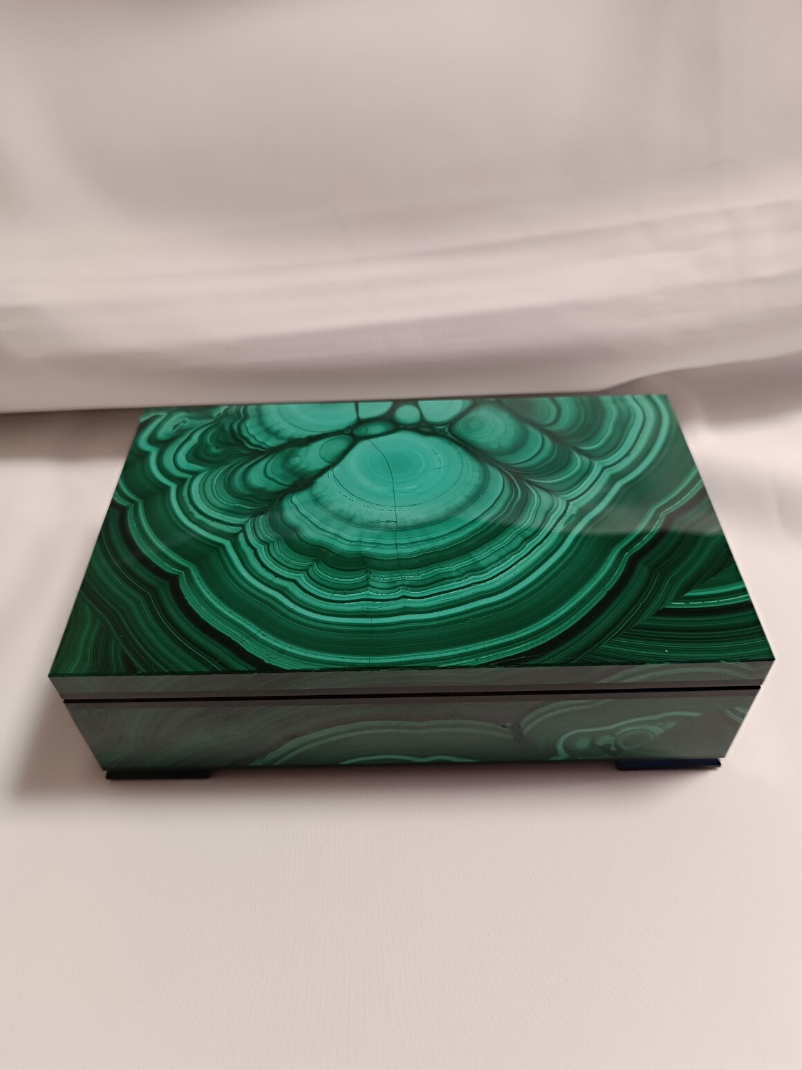 Шкатулка сделана Уральским Мастером из природного малахита.Размер шкатулки 173-103-53 мм . Шкатулка внутри обклеена зеленым бархатом. На ножках наклеена специальная ткань чтоб не царапать поверхность. Ножки рамки сделаны из долерита , шарниры из латуни (Ручная работа)