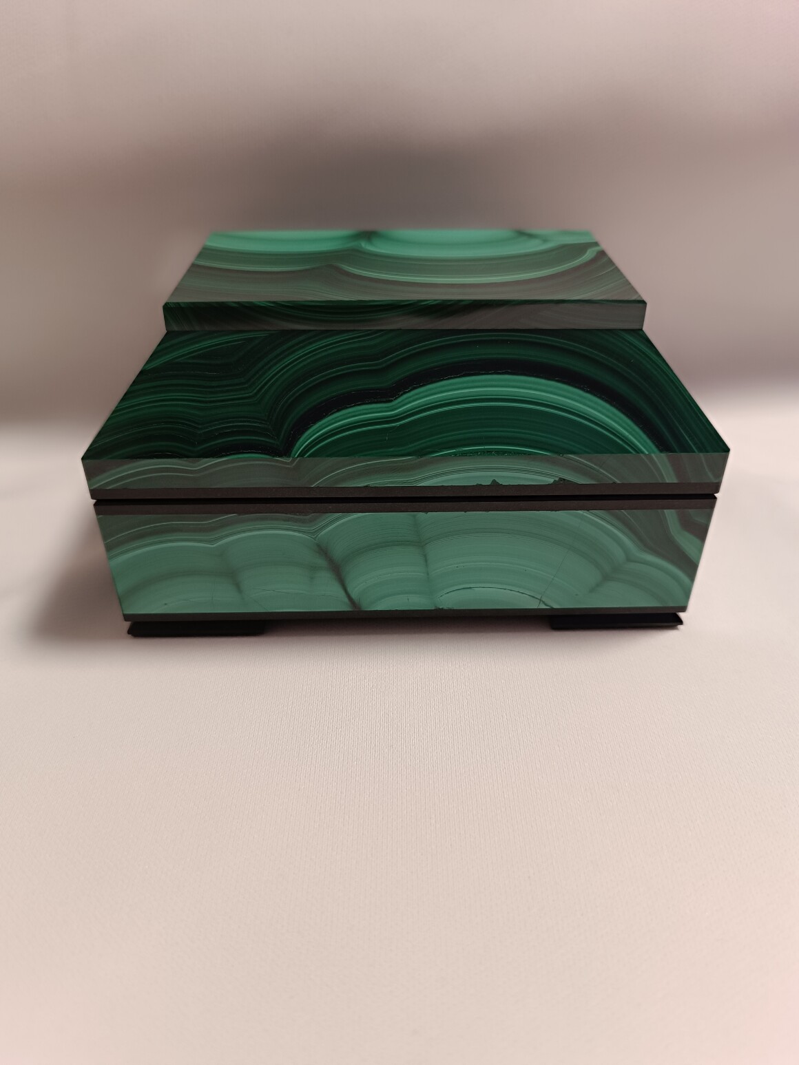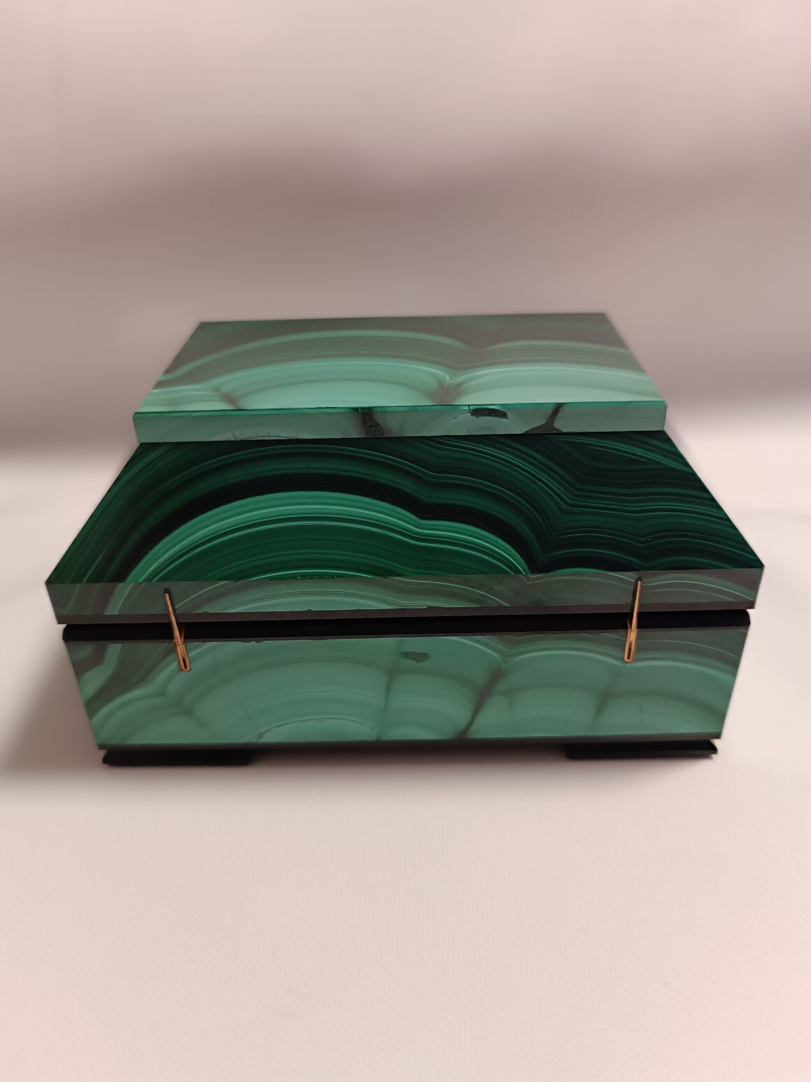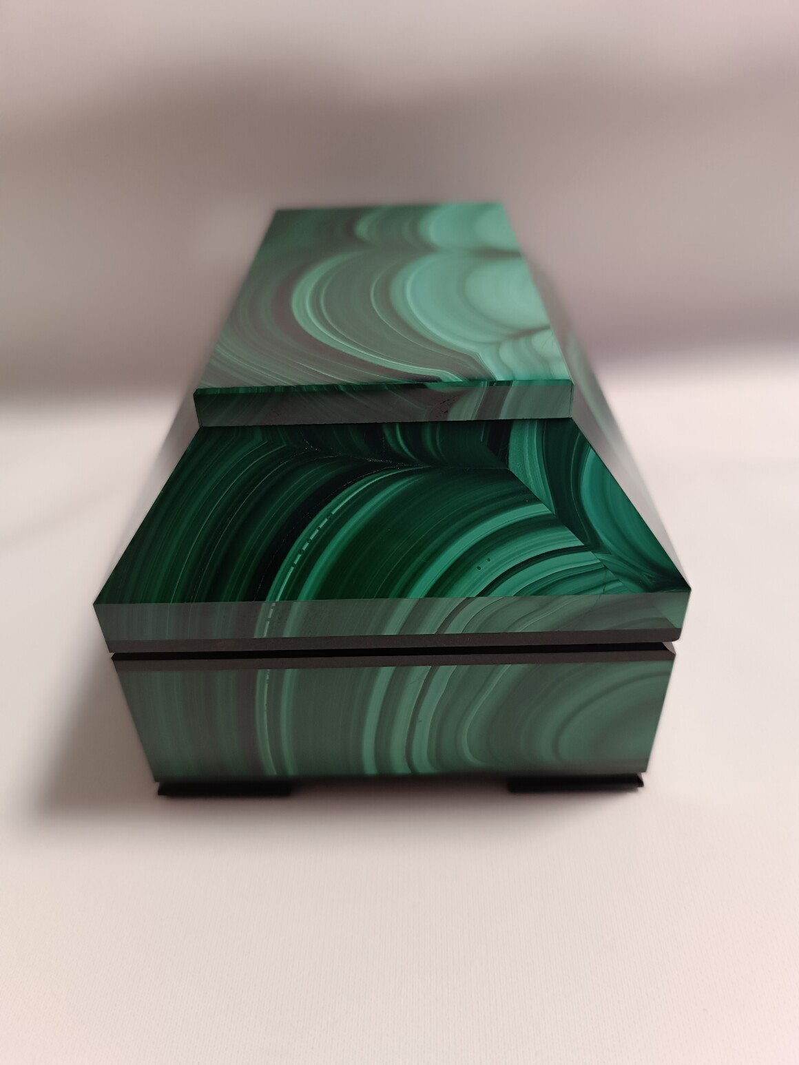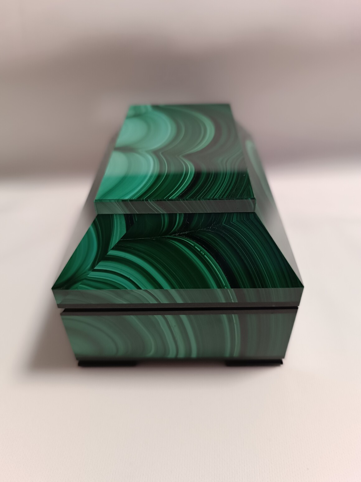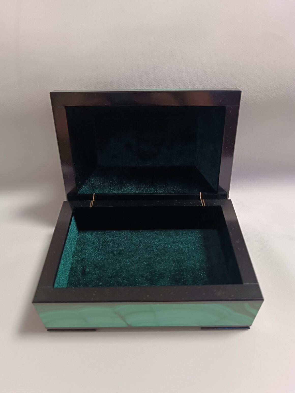 Ларец 120-80-65 мм сделан из натурального малахита , рамки, донышко , ножки сделаны из долерита , шарниры из латуни . Внутри бархат зеленного цвета. На ножках специальная ткань чтоб не царапать поверхность.