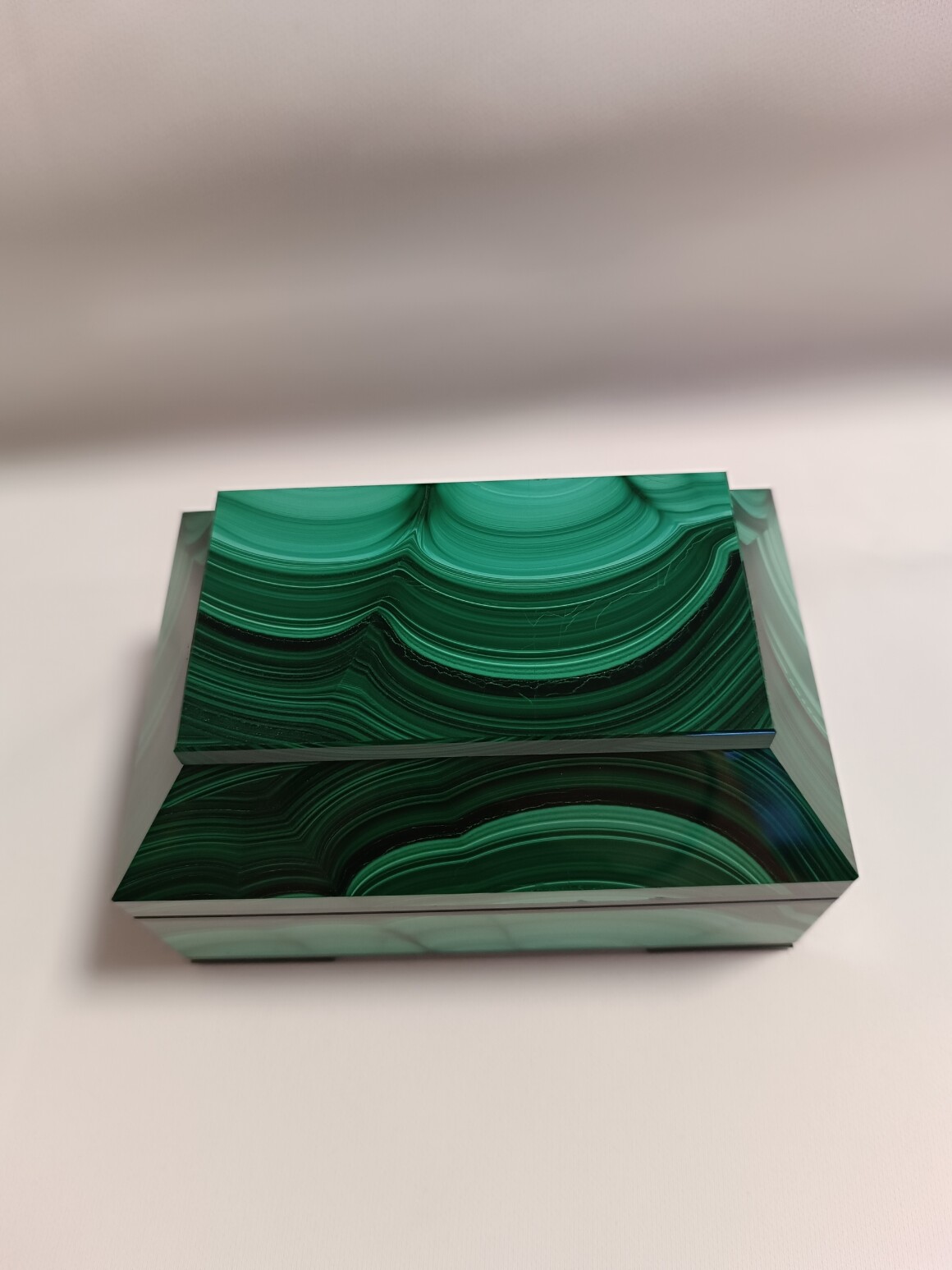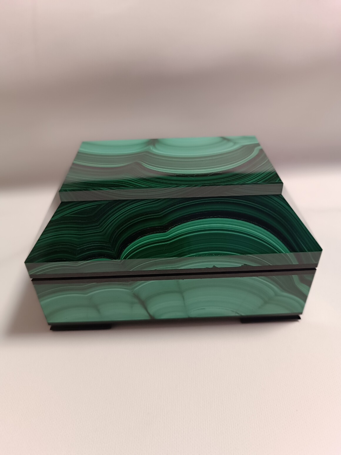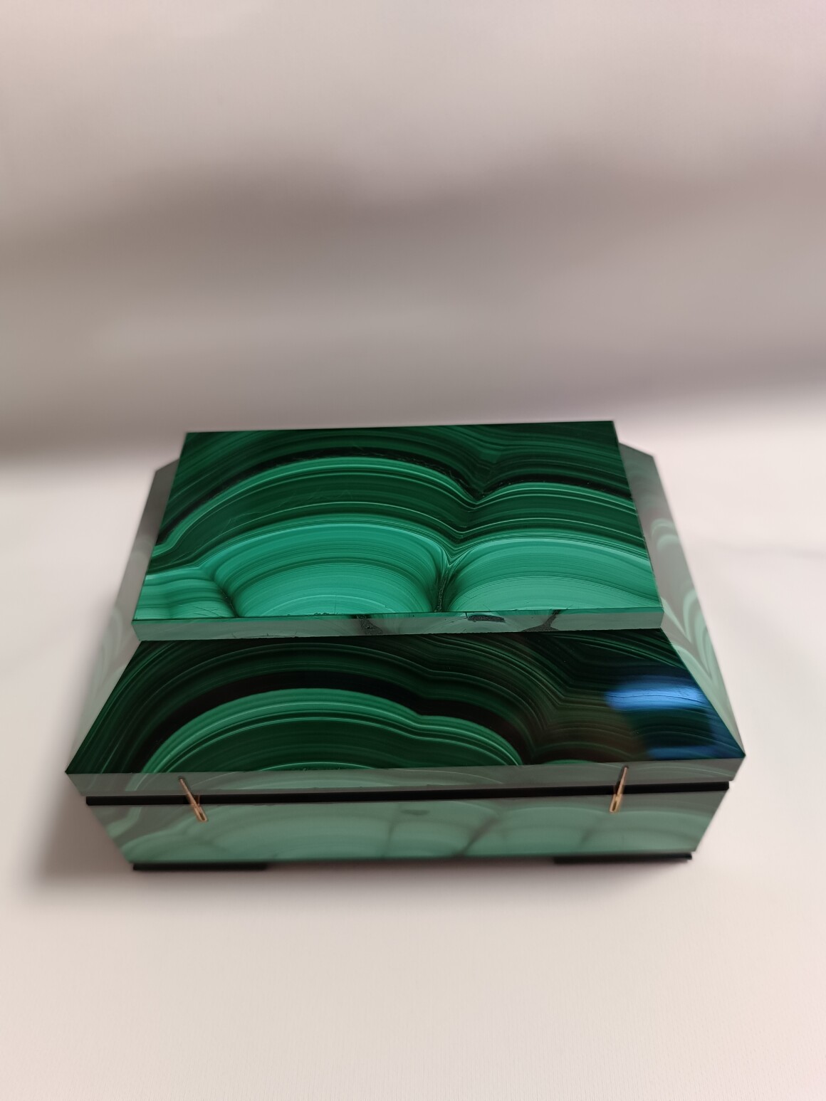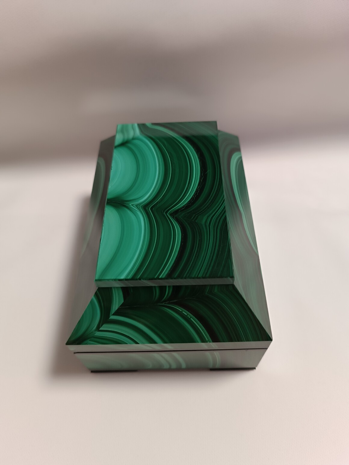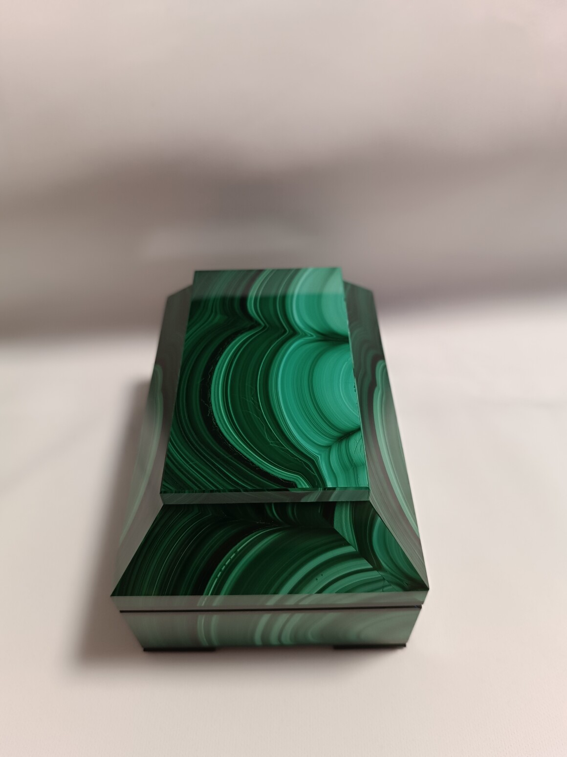 Ларец 120-80-65 мм сделан из натурального малахита , рамки, донышко , ножки сделаны из долерита , шарниры из латуни . Внутри бархат зеленного цвета. На ножках специальная ткань чтоб не царапать поверхность.