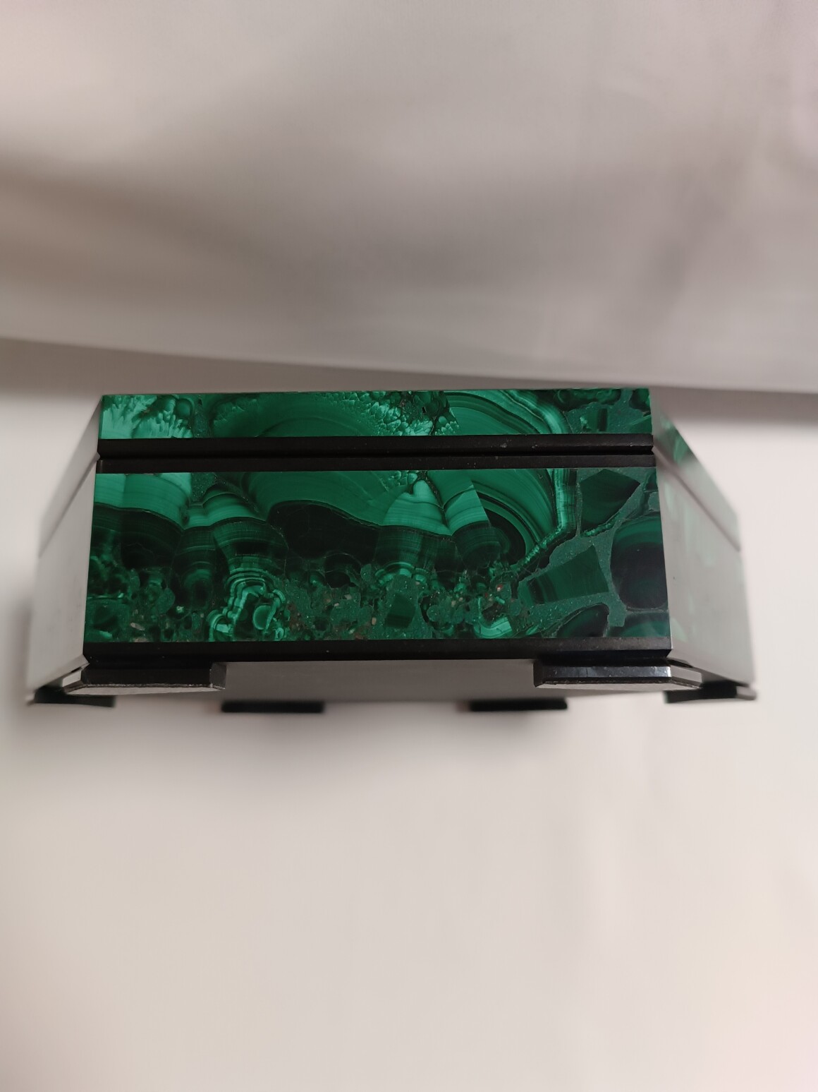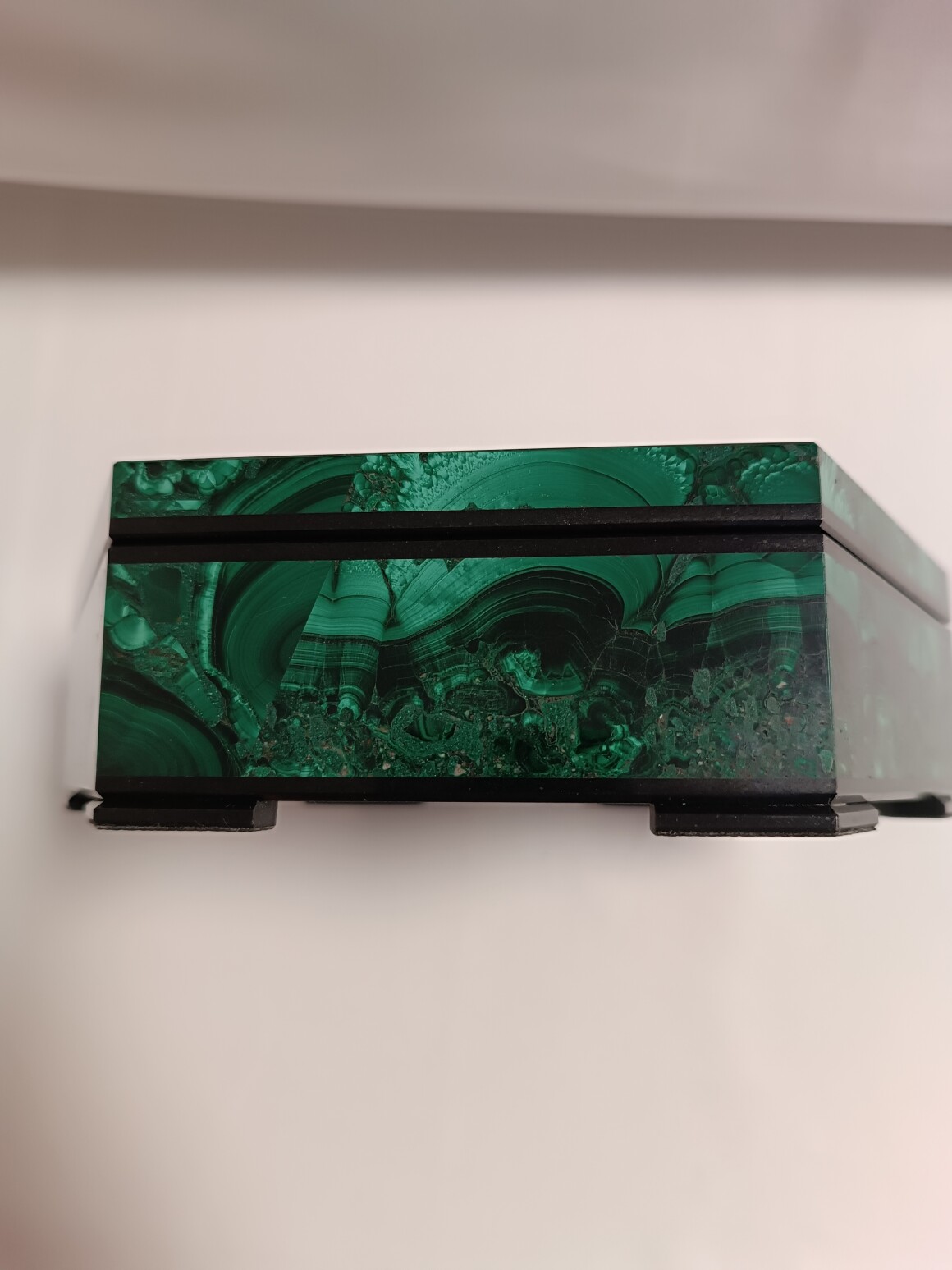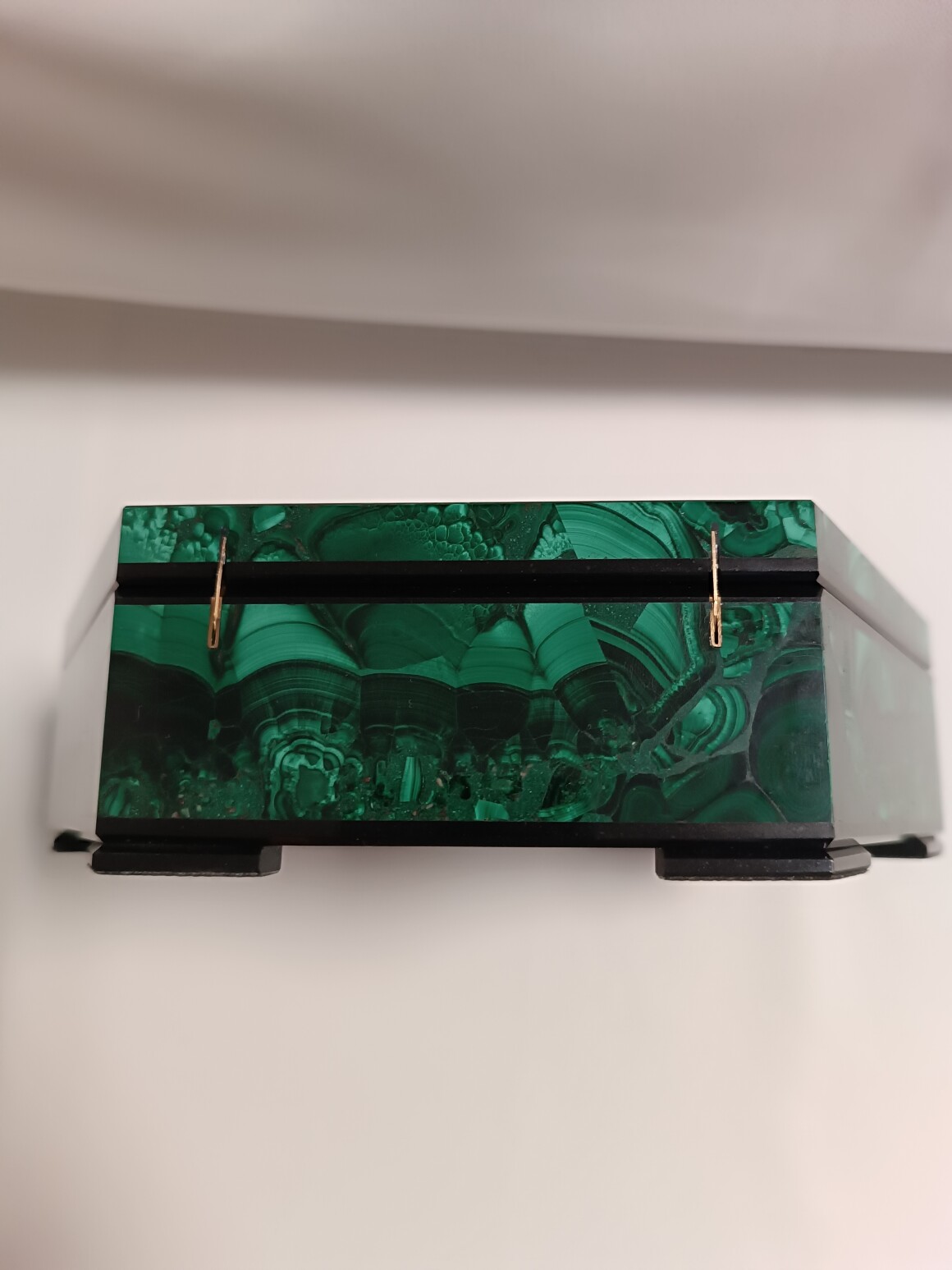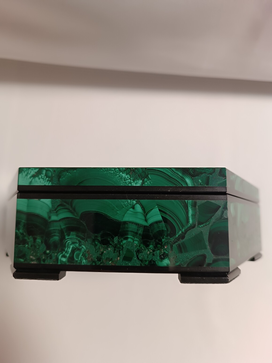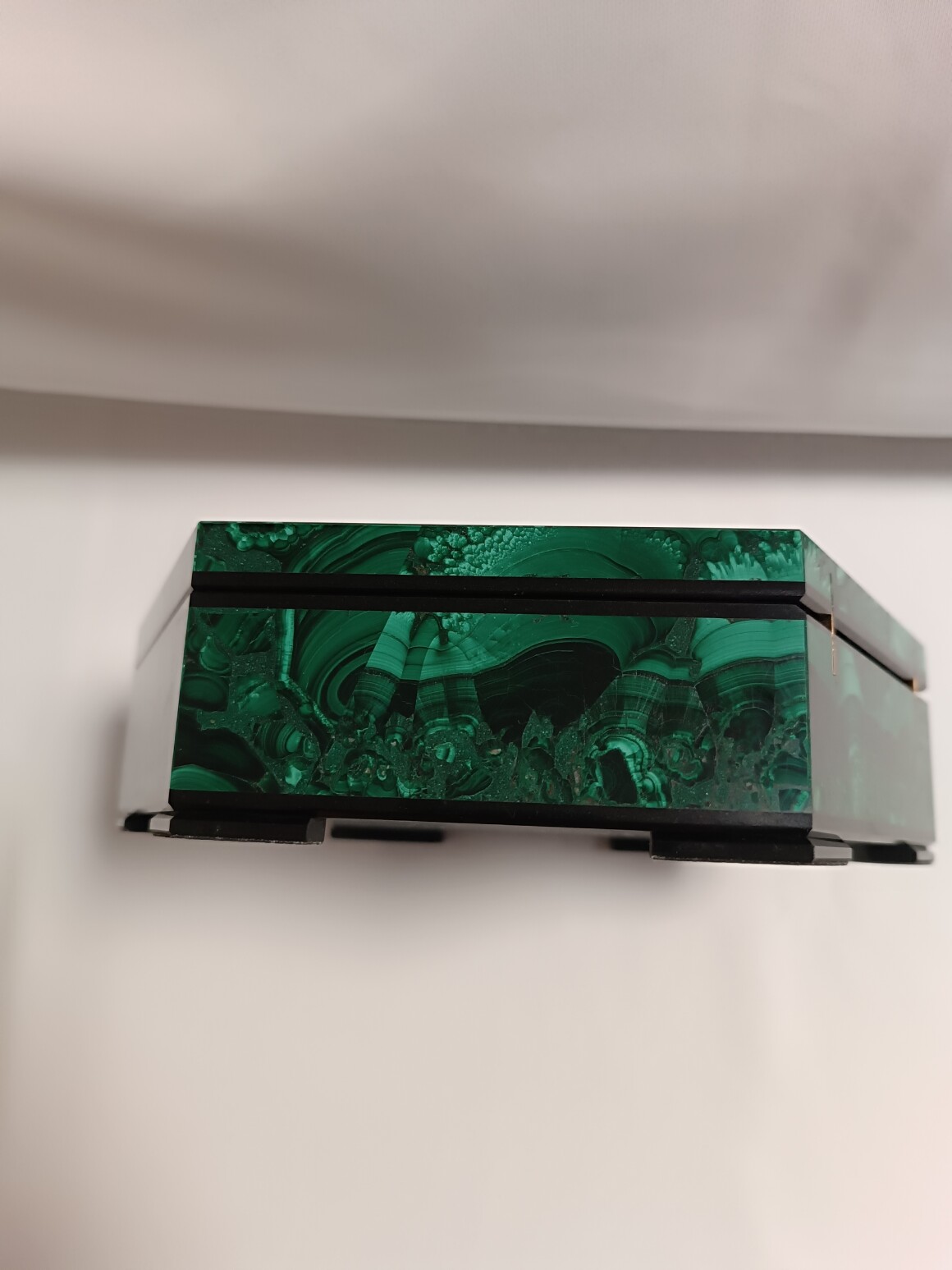 Шкатулка сделана Уральским Мастером из природного малахита.Размер шкатулки 180-180-55 мм . Шкатулка внутри обклеена зеленым бархатом. На ножках наклеена специальная ткань чтоб не царапать поверхность. Ножки рамки сделаны из долерита , шарниры из латуни (Ручная работа) Шкатулка вместительная , можно хранить не только ювелирные изделия.